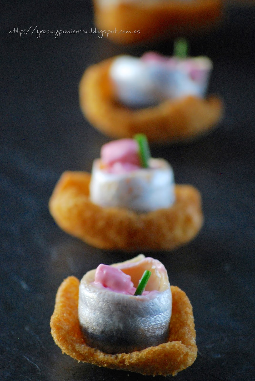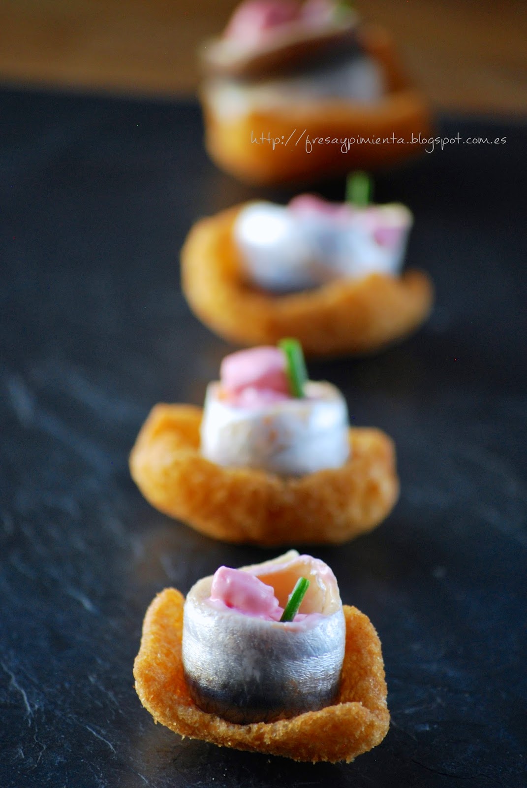 Este aperitivo no puede ser más sencillo, pero no deja de ser una manera diferente de presentar los boquerones, de un modo un poco más atractivo y sobretodo gustoso. Una base crujiente, un boquerón y mahonesa de remolacha.