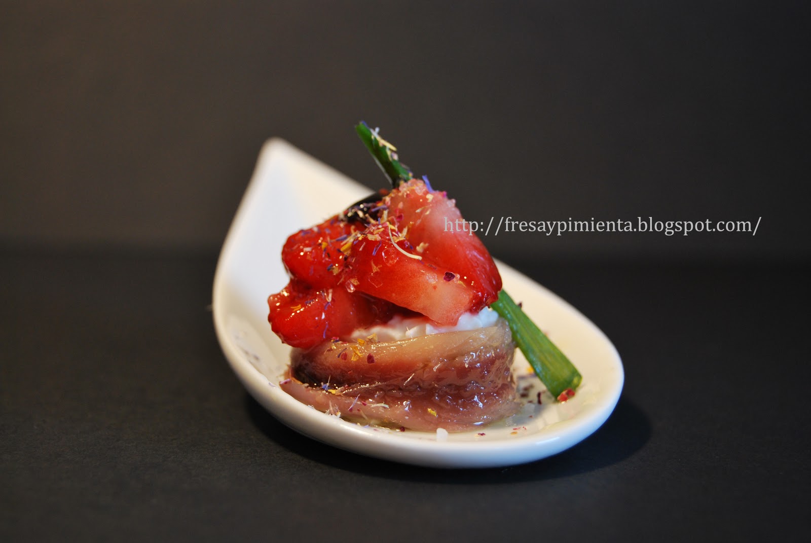 fresaypimienta, bonísima aquesta combinació del recuit de drap, les maduixes i les anxoves.