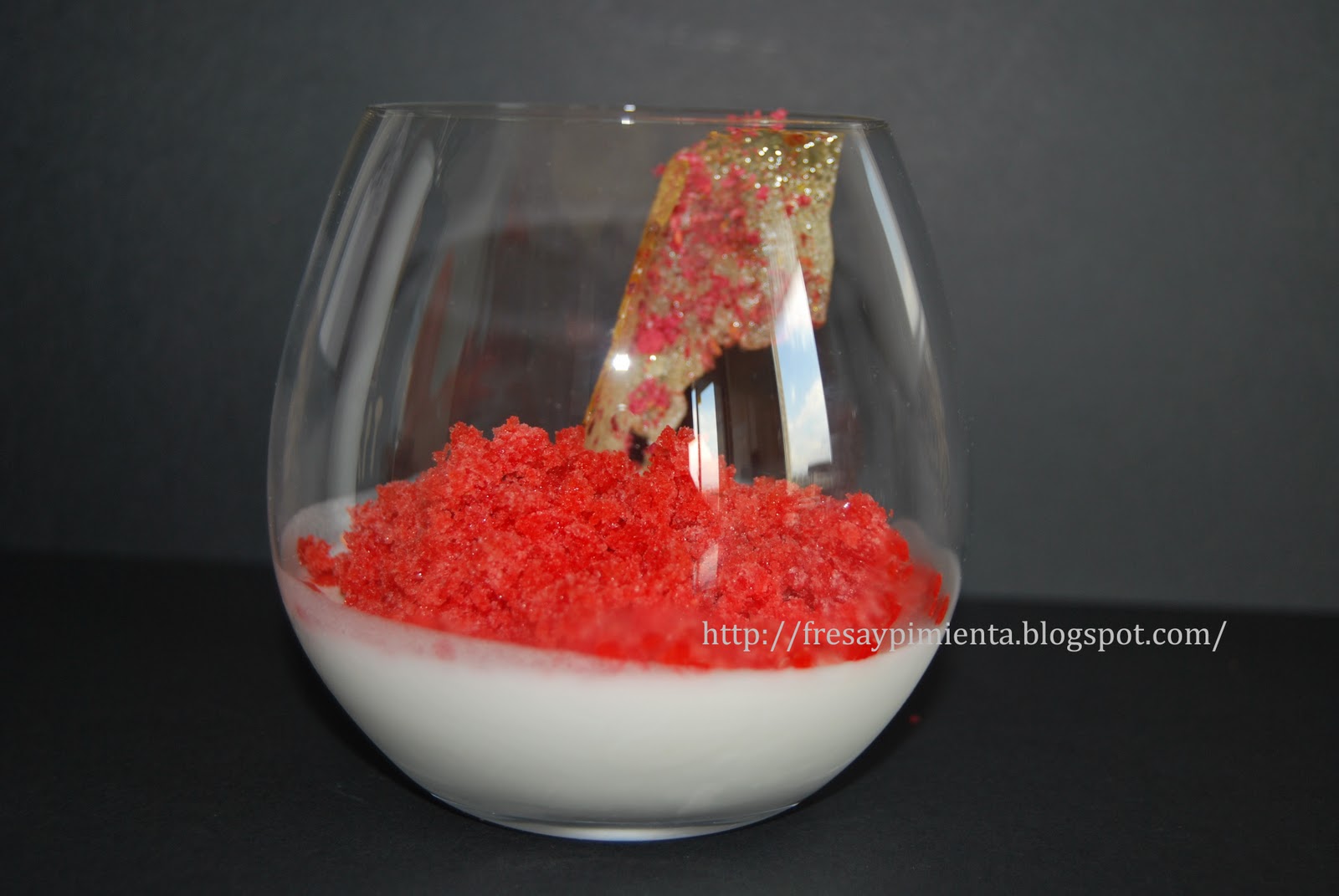 En primer lugar para realizar el granizado, trituramos con un túrmix las fresas y las pasamos por el chino, añadimos el coulis de fruta de la pasión (si vamos a utilizar fruta de la pasión, porque no tenemos el coulis, tendremos que triturar la fruta de igual manera que las fresas y pasar por el chino).
