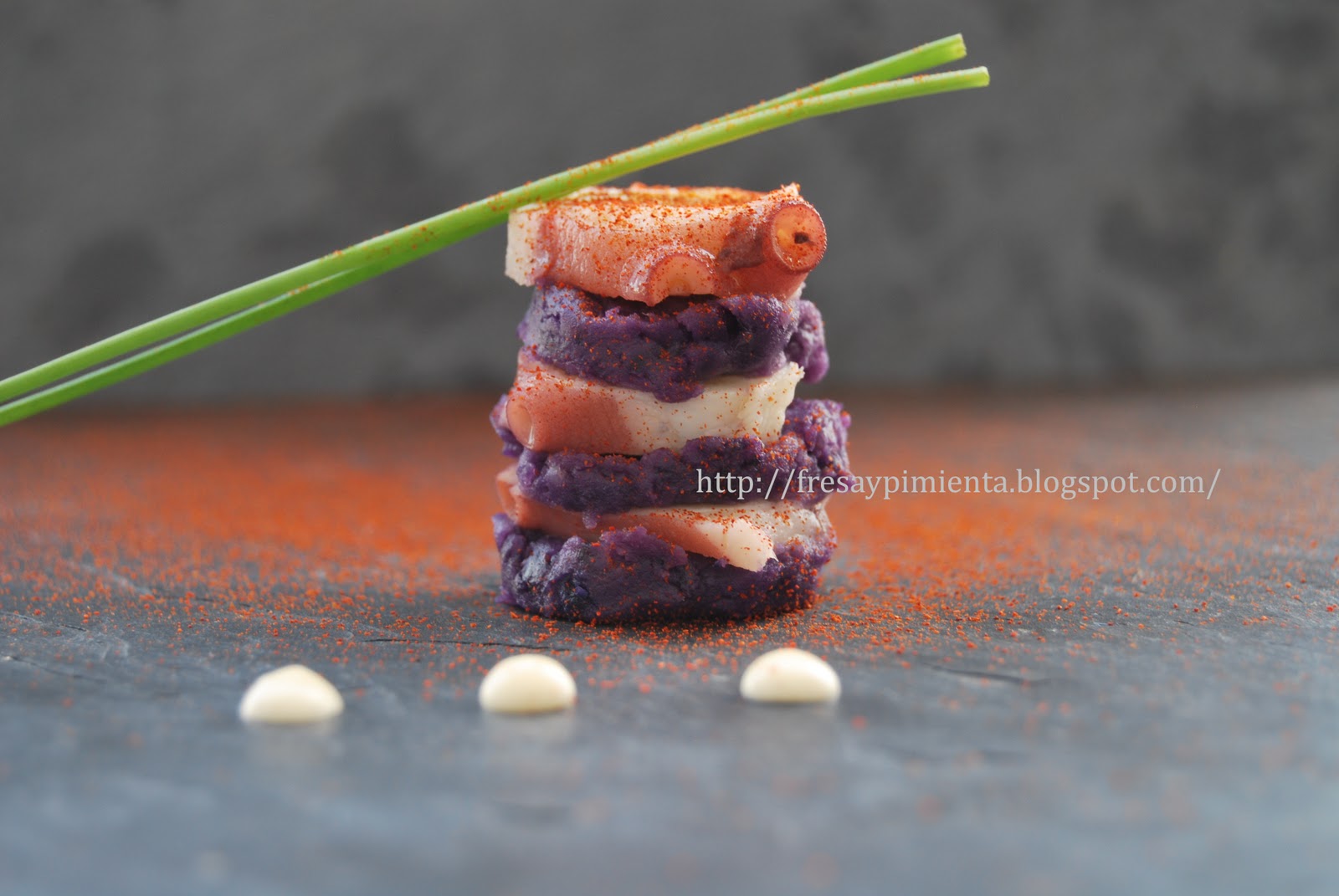 Montamos el plato: Ayudándonos de un círculo de cocina, ponemos una primera capa del puré de patata azul, y encima de éste ponemos una rodaja de pulpo, vamos alternando capas hasta finalizar con una rodaja de pulpo. Disponemos alrededor la mahonesa de cardamomo, al gusto. Decoramos con cebollino y espolvoreamos con pimentón (opcional).