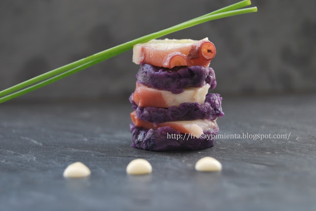 He querido confeccionar esta receta con patata azul, es una variedad de patata que sorprende por su color violeta intenso, es un poco más dulce que la patata normal y tiene un cierto sabor a nuez. No me ha sido fácil encontrarla, tan sólo la he visto en el Mercado de la Boquería en Barcelona, si bien supongo que se podrá adquirir en determinados establecimientos especializados.