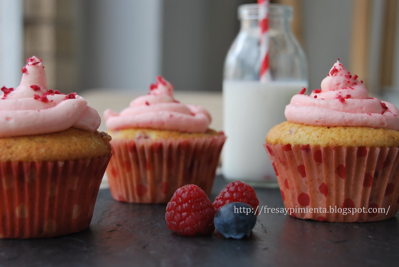 Te han quedado muy bonitos. El frosting tiene que ser delicioso con estos trocitos de frambuesa liofilizada! Y seguro que queda genial con el punto ácido de la fruta del interior del cupcake.
