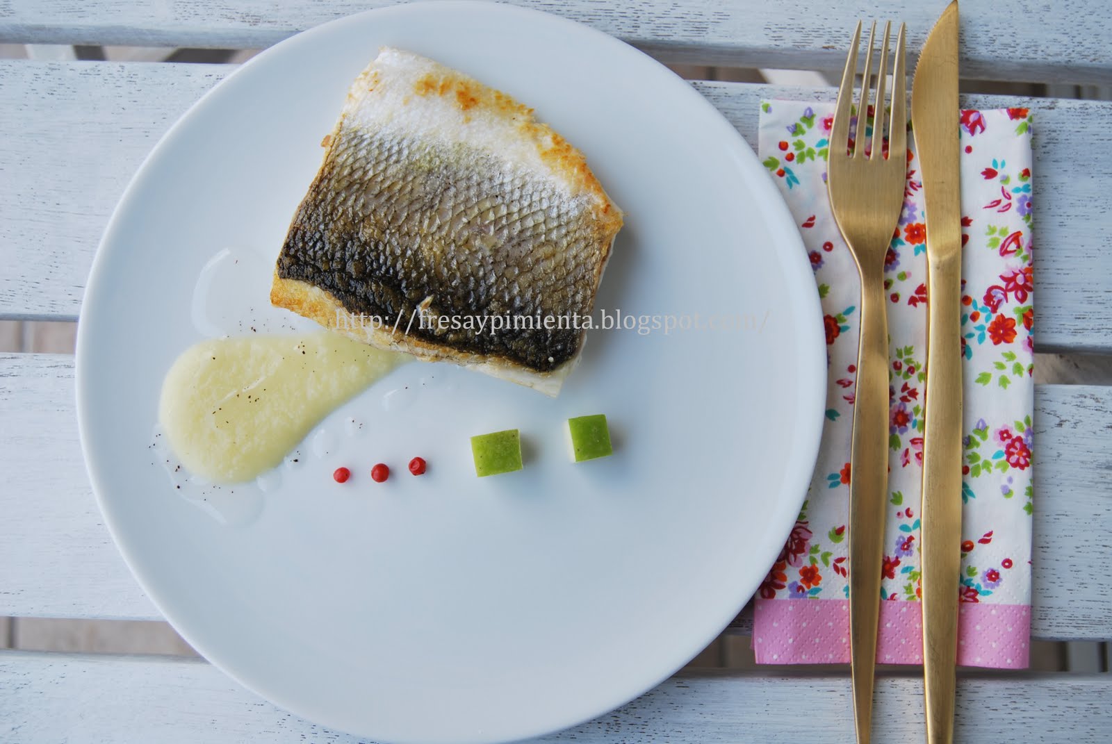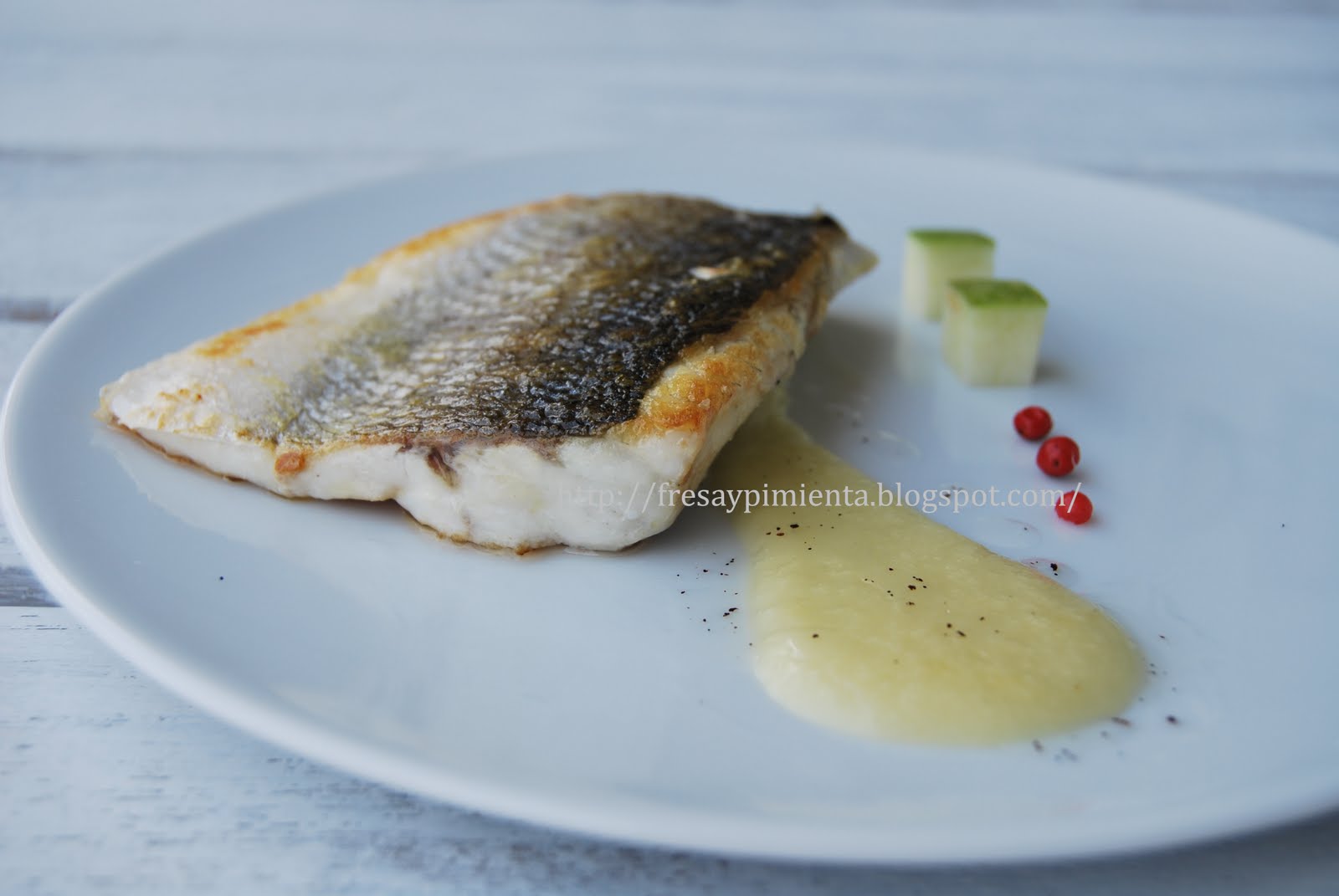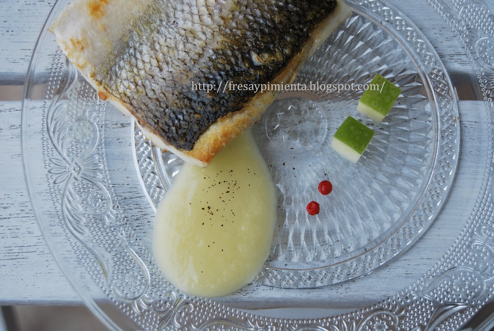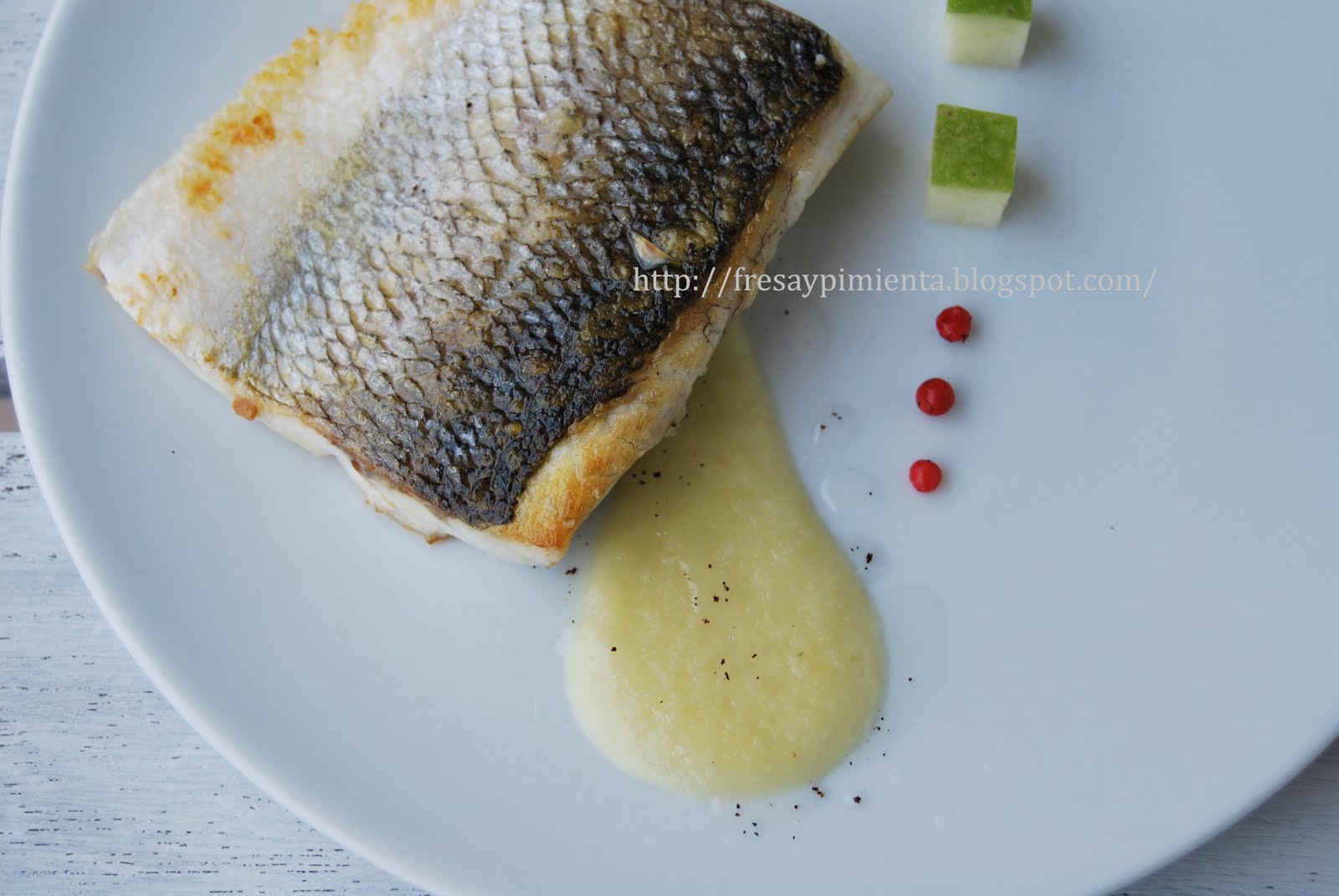 Tras unos días alejada de internet y de la cocina vuelvo con nuevos contrastes, en este caso una deliciosa lubina acompañada con una salsa de manzana y cava junto a un aromático aceite de vainilla. Es una combinación muy sutil, sin duda destacaría la buena sintonía entre la lubina y la vainilla, es ideal.