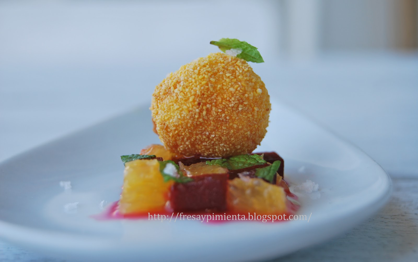 Coulant de mozzarella y polenta sobre mosaico de remolacha, naranja y menta