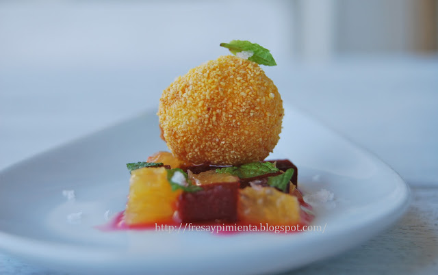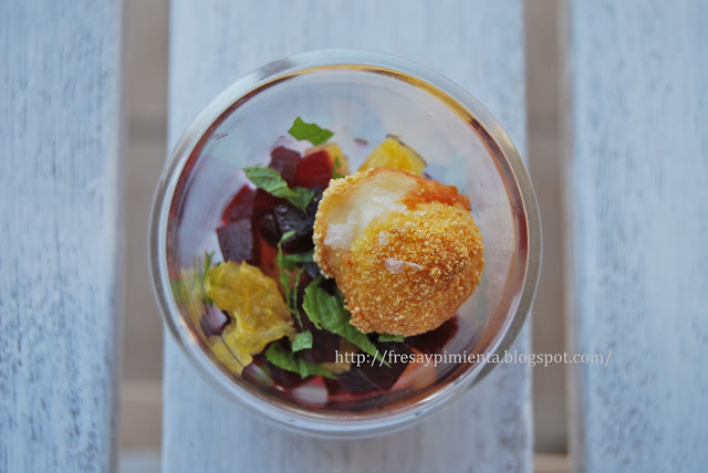 De nuevo vuelvo con mis pequeños bocados, en este caso un aperitivo de contrastes sorprendentes, tanto por gustos como por texturas. Una curiosa ensalada de remolacha y naranja, aromatizada con menta fresca; y como colofón, una crujiente polenta envuelve un corazón fundido de mozzarella.