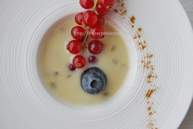 Frambuesas, grosellas, arándanos o moras, estos pequeños frutos del bosque han quedado fantásticos bañados en una sopa fría de coco, chocolate blanco y fruta de la pasión, aromatizada con un punto de vainilla. Un postre sencillo de elaborar pero elegante y sobretodo un contrate de sabores delicioso.