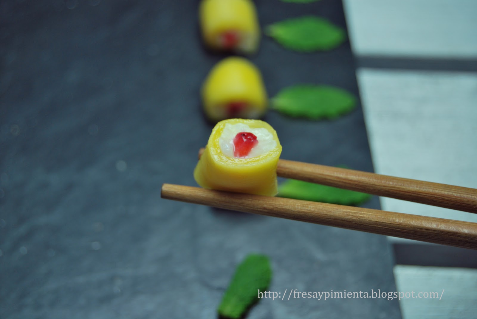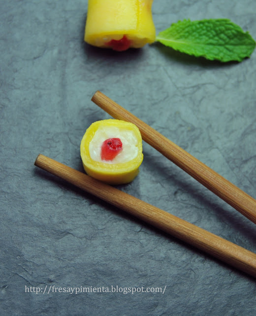 Sabes? Creo que este delicioso e imaginario sushi tiene que estar increiblemente bueno. Sólo de leer esos ingredientes, arroz… leche de coco… fresas.., oh, por favor, y envuelto en una lámina de mango natural!!!!