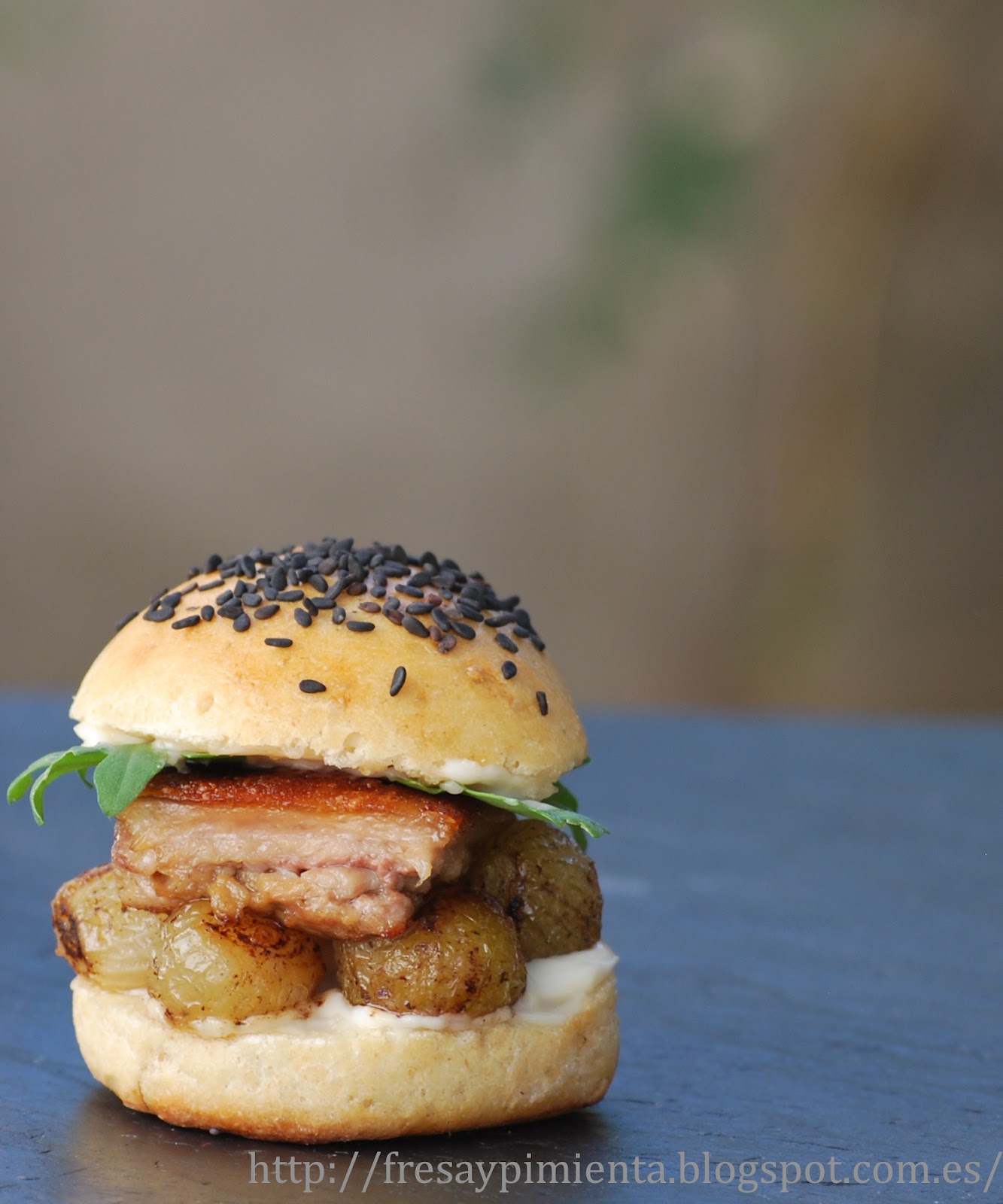 Para finalizar, simplemente montamos la burg, cortamos el panecillo, lo untamos con la mahonesa, disponemos las cebollitas francesas, sobre éstas el trozo de cochinillo y la rucola, cubrimos que la parte superior del panecillo, que también habremos untado en mahonesa y a disfrutar!!!!!