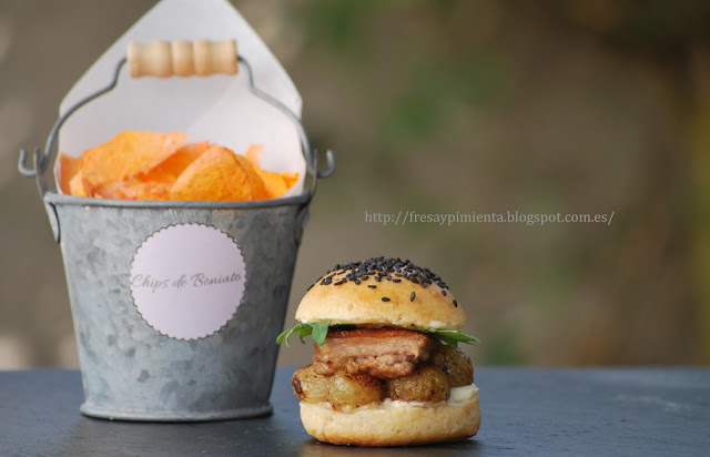 La receta del cochinillo es de una gran cocinera, mi madre, yo tan sólo le he dado una versión de “cena informal” en formato de mini burg acompañada de estas chips de boniato.