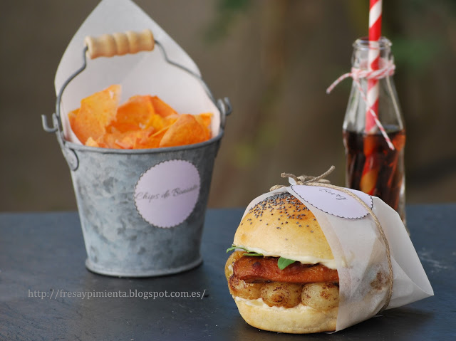 ¿Y los chips de boniato??? Me dejas con las ganas de saber como se hacen, me encantan… No soy nada carnívora pero al ver la pinta que tiene esa burguer casi me da algo, wowww qué pinta!!! Si la pilla mi catador no deja ni las migas..