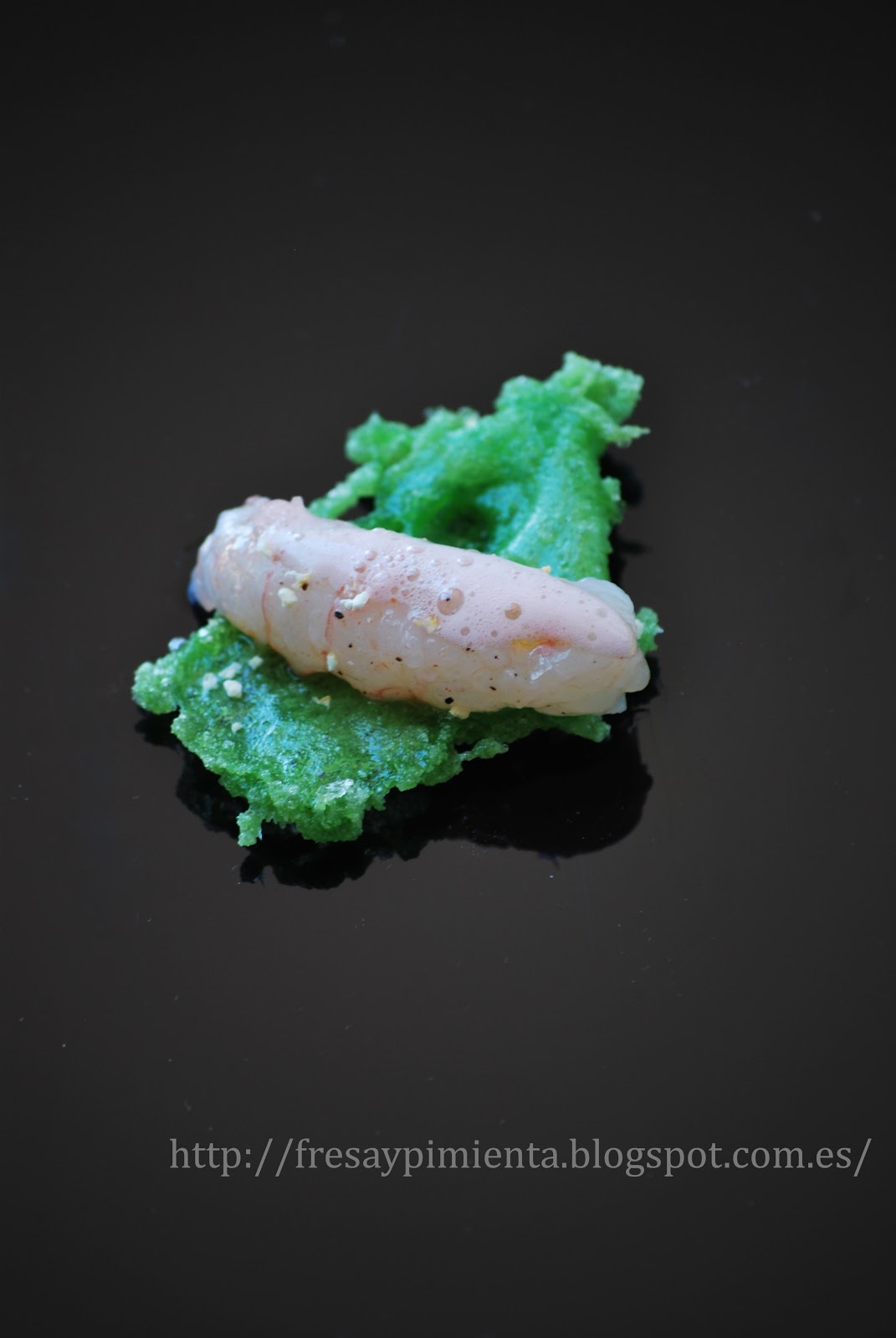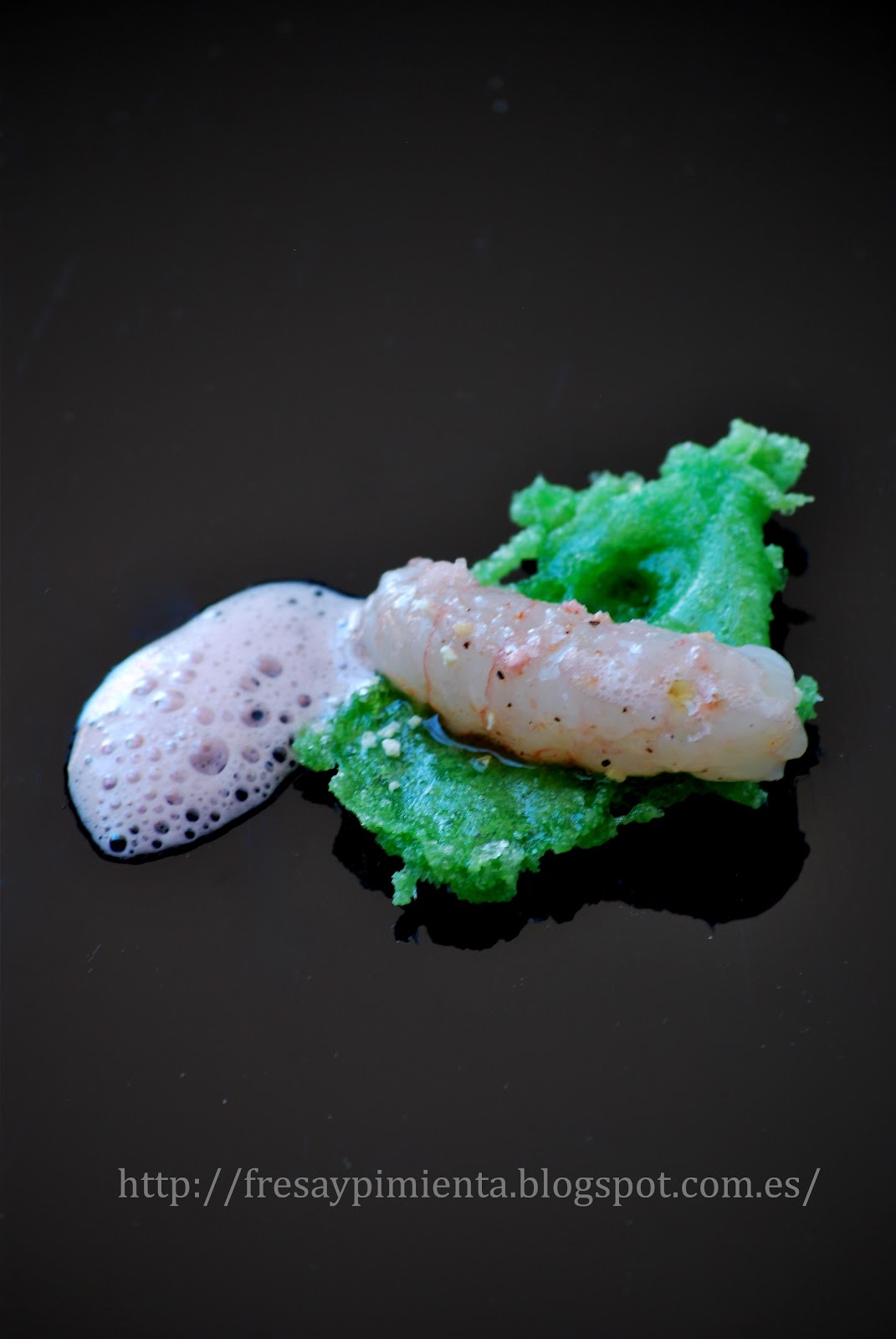 Una lámina crujiente elaborada con arroz verde vietnamita, es el soporte de esta cigala marinada en lima y jengibre. El vermut llega a este singular aperitivo en forma de un aire de Campari y granada.