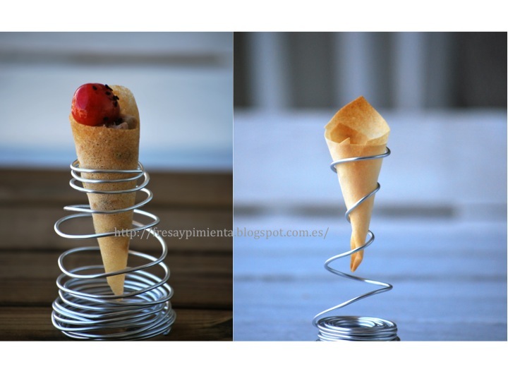 un cucurucho bien original y muy apetecible,todavía no he practicado con estas hojas de Spring roll