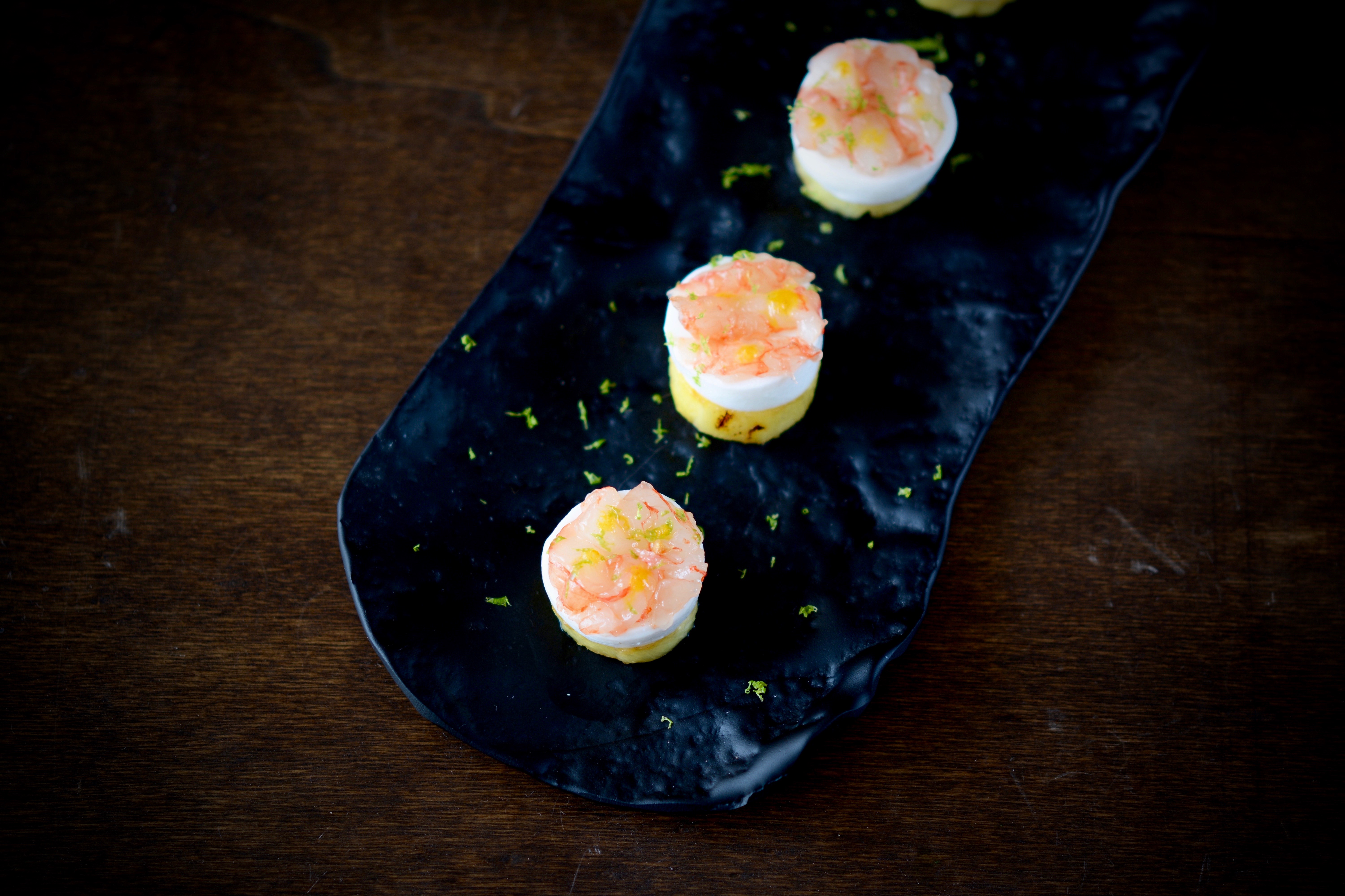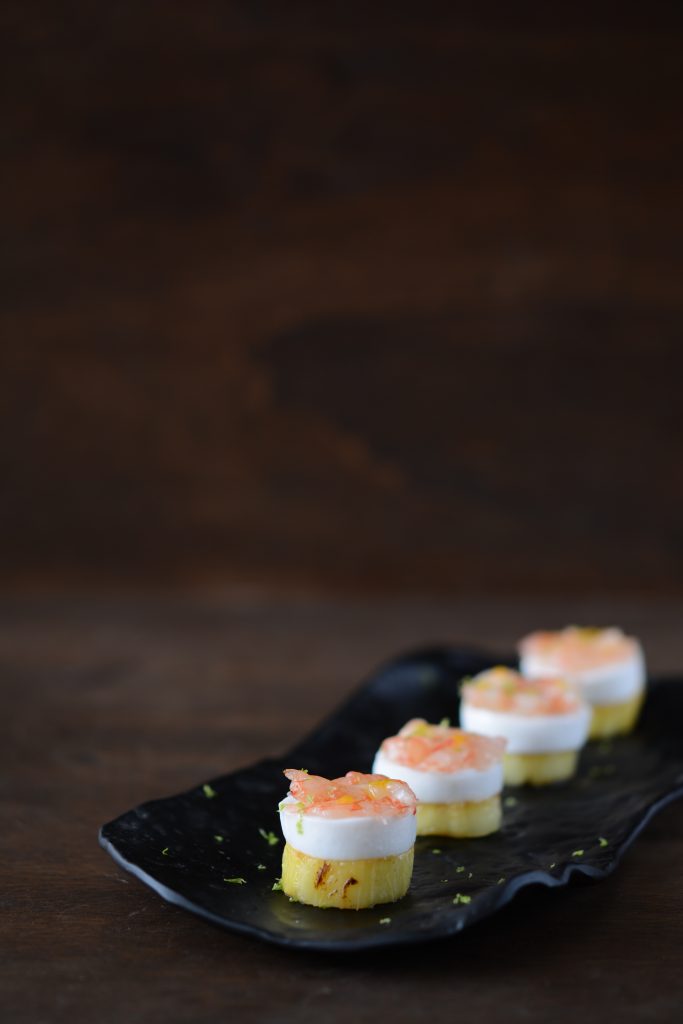 Aperitivo con un marcado contraste de sabores. Finas laminas de gamba fresca con salsa de aji amarillo sobre un bocado de coco y de piña fresca a la plancha