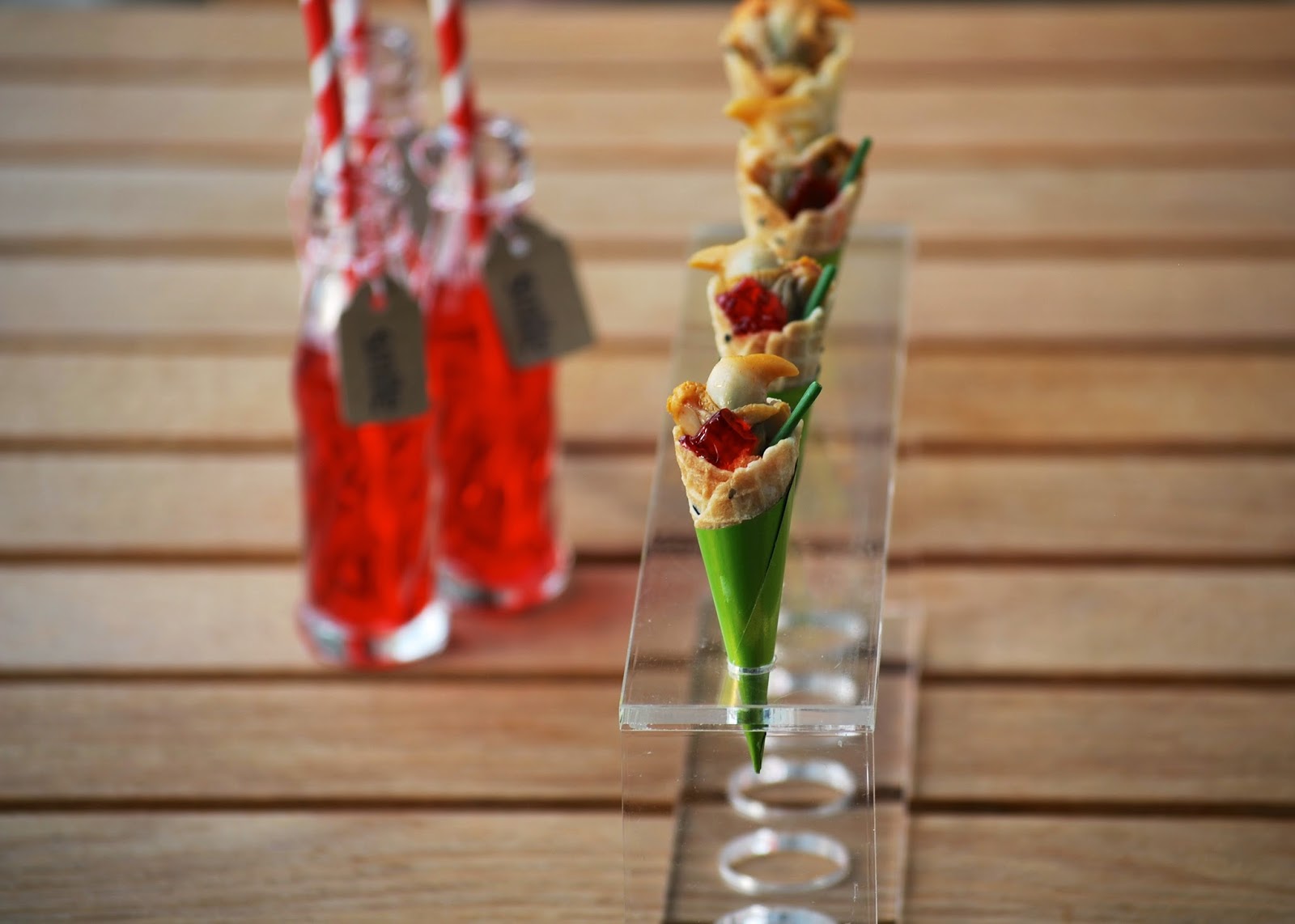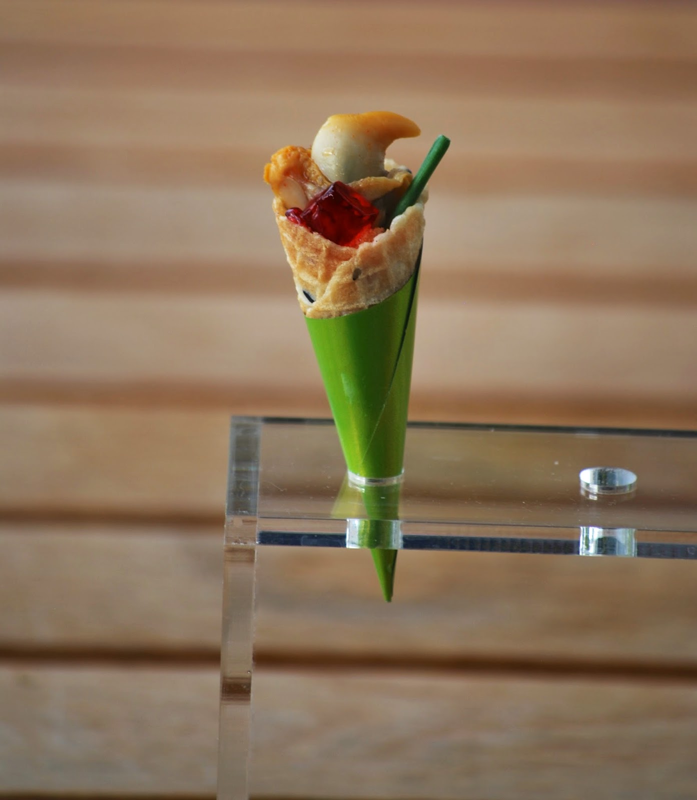 He utilizado como soporte unos cucuruchos de galleta salada, los he rellenado con corteza de trigo picada, para formar una base. Como colofón he colocado el berberecho aliñado con chili pepper junto con un cubo de gelatina que he elaborado con vermut Campari y zumo de naranja.