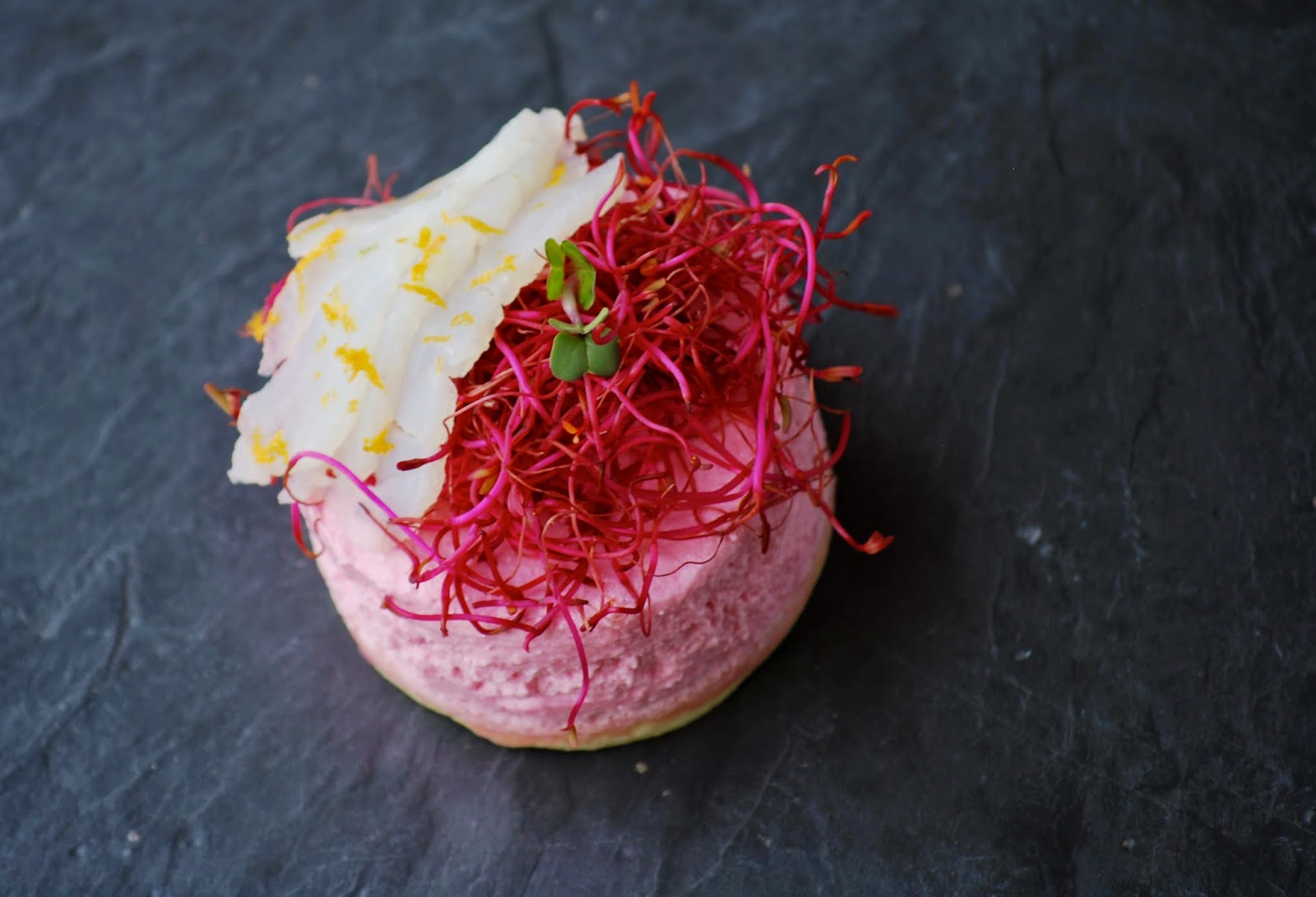 Un entrante refrescante y colorido: Mousse de remolacha con bacalao desalado y naranja sobre una base crujiente de pasta brisa preparada en casa.