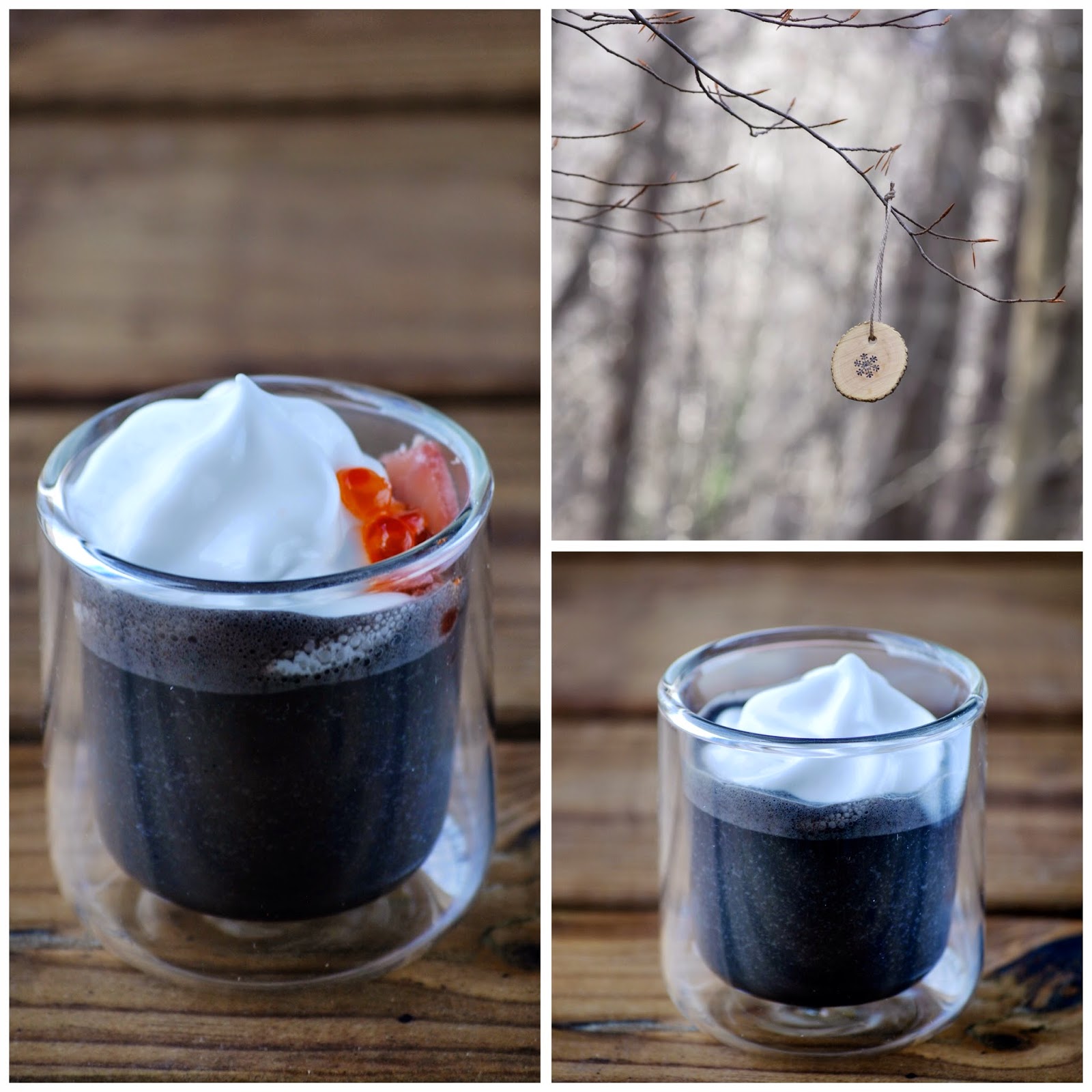 Después de muchos bocetos he logrado materializar lo que sólo estaba en la imaginación. Quería hacer un aperitivo cuya base fuera el ajoblanco malagueño, con su base de almendra cruda, pero quería darle la vuelta y hacer un ajonegro, para ello he utilizado los ajos negros y la tinta de calamar. Esta base de ajonegro la he combinado con huevas de salmón (también con bonito ahumado es delicioso)  todo contrastado con una suave espuma de coco.