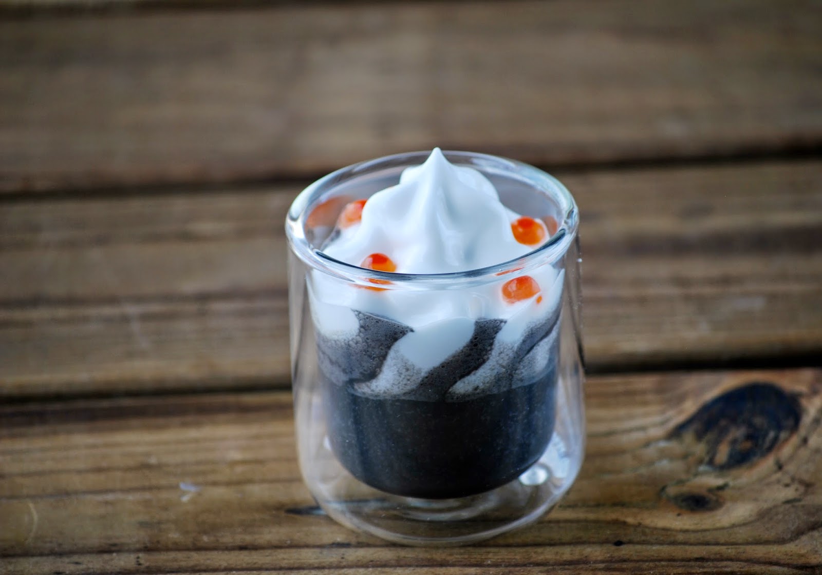 Cappuccino de ajonegro, espuma de coco y huevas de salmón