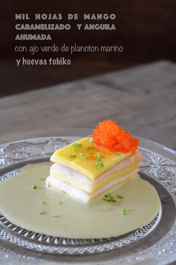 Para montar el plato, disponemos en la base del plato una cucharada de ajo verde. Hacemos un milhojas alternando una lámina de mango con un lomo de anguila ahumada, finalizando con una lámina de mango. Espolvoreamos un poco de azúcar sobre la última lámina de mango y la quemamos con un soplete, para caramelizarlo. Finalmente culminamos con una cucharadas de huevas tobiko y cebollino picado.