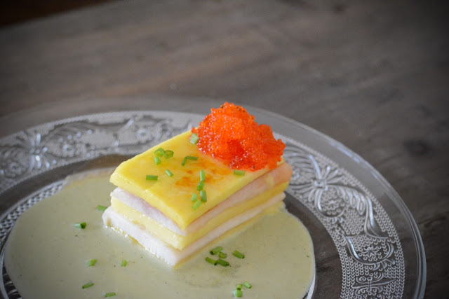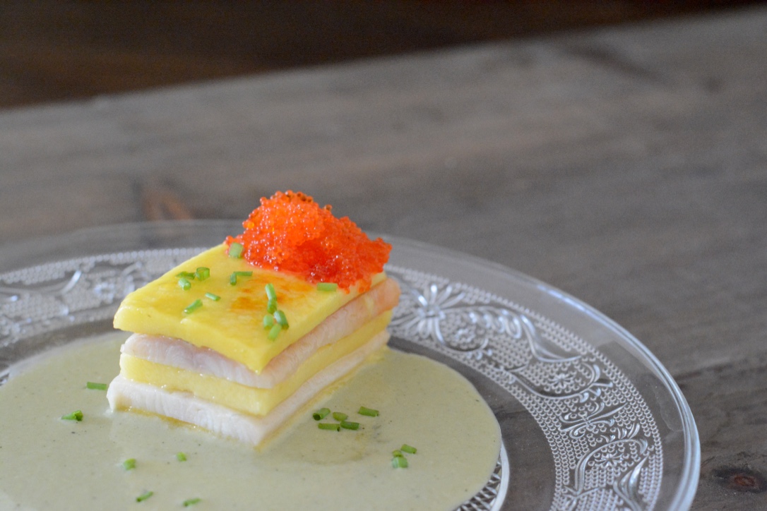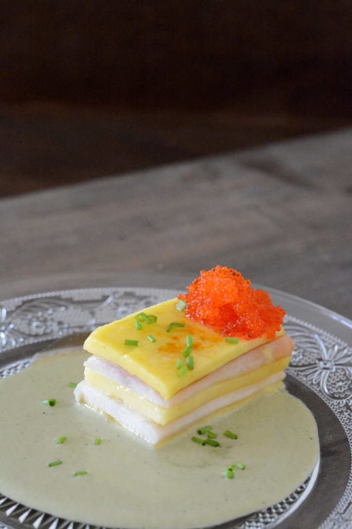 Una receta de contrastes protagonizada por capas alternadas de anguila ahumada y mango caramelizado con ayuda de un soplete. En la base del plato un refrescante ajobando malagueño, que en este caso se vuelve verde al añadirle el plancton, que le aporta un fantástico sabor a mar, y unas huevas tobiko que potencian el sabor y le da otra textura al plato.