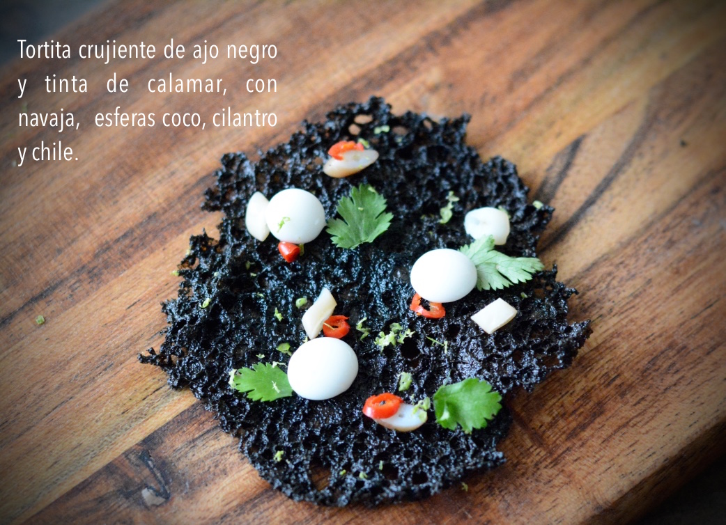 Tortita “no de camarones” sino de ajo negro y tinta de calamar, hiper crujiente y fina, con navajas, cilantro, chile y unas esferas de coco y lima, que le aportan un punto fresco a este bocado.