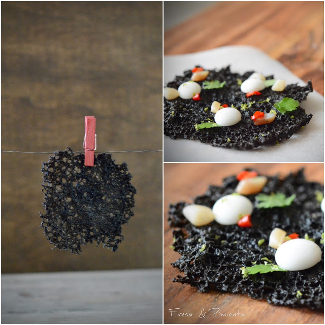 Montamos el plato, colocamos una tortita de ajo negro y tinta de calmar, sobre ésta depositamos unas perlas de coco (que habremos extraído del aceite con ayuda de una cuchara agujereada), unas rodajitas de navaja, cilantro y chile. Finalmente rallamos un poco de lima fresca.