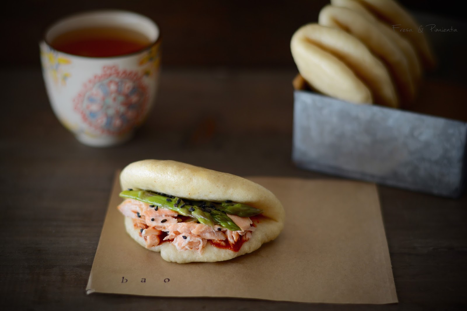 Unos bollitos cocinados al vapor, al más puro estilo street food asiático, son los Bao Buns! he preparado estos molletes con aceite de coco, y como son tan versátiles, al admitir multitud de rellenos, es fácil volverse fanáticos de ellos, ya que son fáciles de preparar y muy apetecibles. En este caso los he rellenado de salmón cocinado al vapor con jengibre y lemongrass, desmigado junto a unos espárragos frescos al vapor, aceite de sésamo y el punto picante de la salsa kimchi.