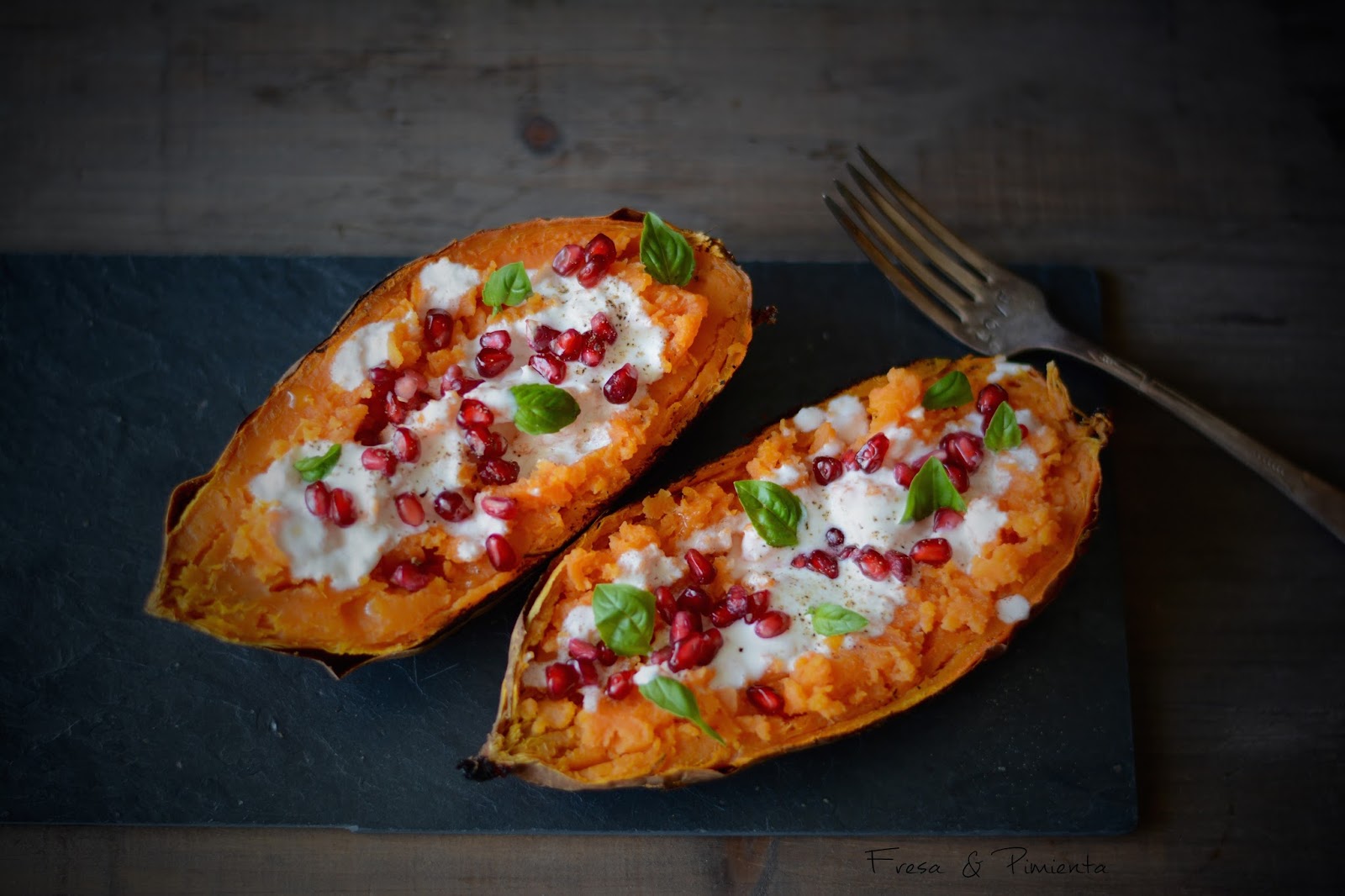 Montamos el plato, para ello cortamos el boniato longitudinalmente. Con un tenedor chafamos la pulpa con una pizca de sal. Aderezamos con el tzatziki de aceite de romero. Esparcimos nos granos de granada, unas hojas de albahaca fresca y pimienta molida.