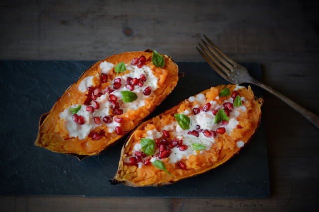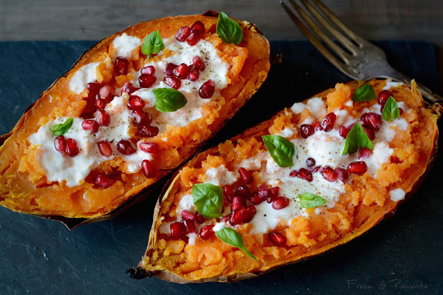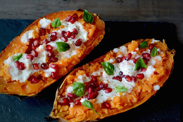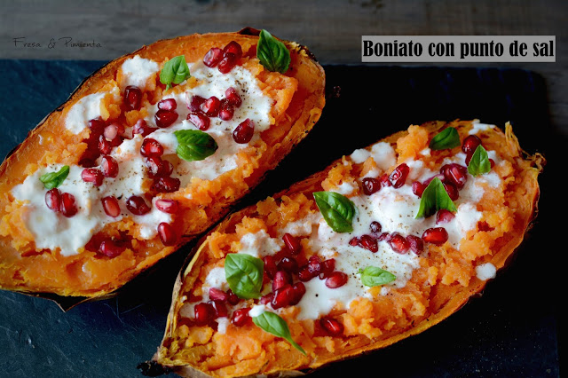 Este es un primer plato con el empezar una comida, sencillo pero no por ello menos delicioso. El boniato asado mantiene todavía su calor al montarse el plato, lo aderezamos con sal y aceite, me encanta el boniato con sal desde bien pequeña, y en esta ocasión lo he aderezado con un tzaziki de yogur y aceite infusionado en romero, unos granos refrescante de granada, pimienta recién molida y albahaca fresca.