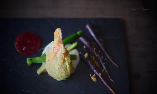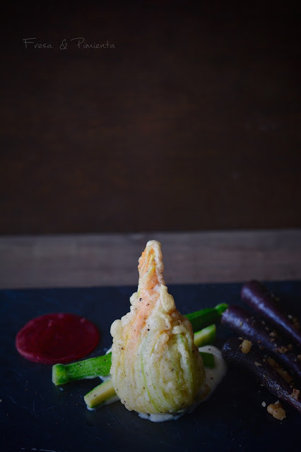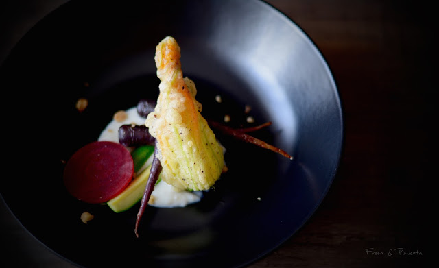 Flor de calabacín en tempura de vainilla, mini zanahorias moradas asadas con avellanas y canela, remolacha a la plancha con cardamomo, pure coliflor con nuez moscada…… se me ha ocurrido orquestar las hortalizas y las especias.
