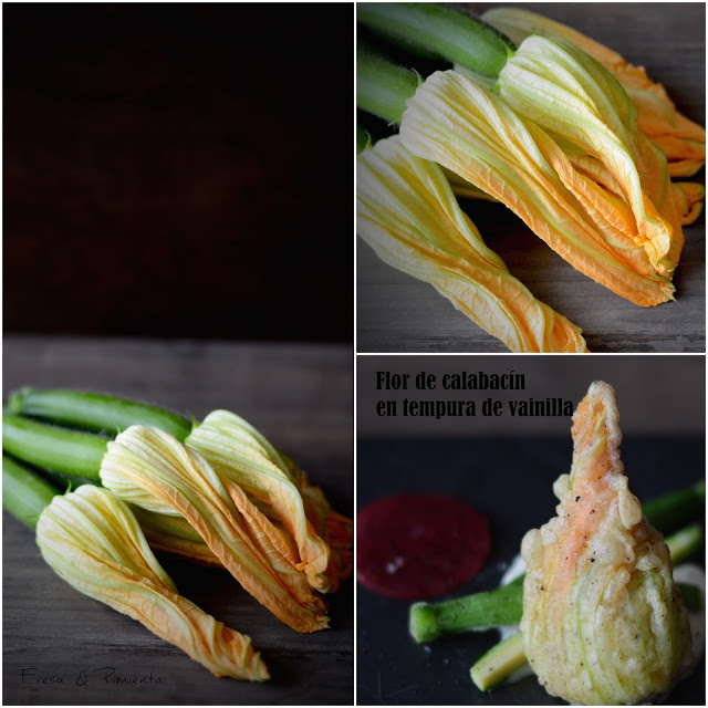 Preparamos las flores de calabacín. Hacemos la base de una tempura con harina, una pizca de levadura y agua bien fría. Añadimos las semillas de ½ vaina de vainilla. Debemos obtener una masa ligera. Salamos las flores de calabacín, las pasamos por la mezcla y las freímos en abundante aceite caliente. Reservamos.