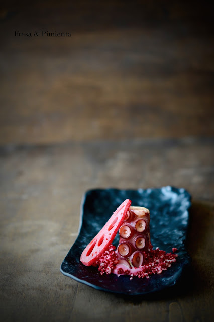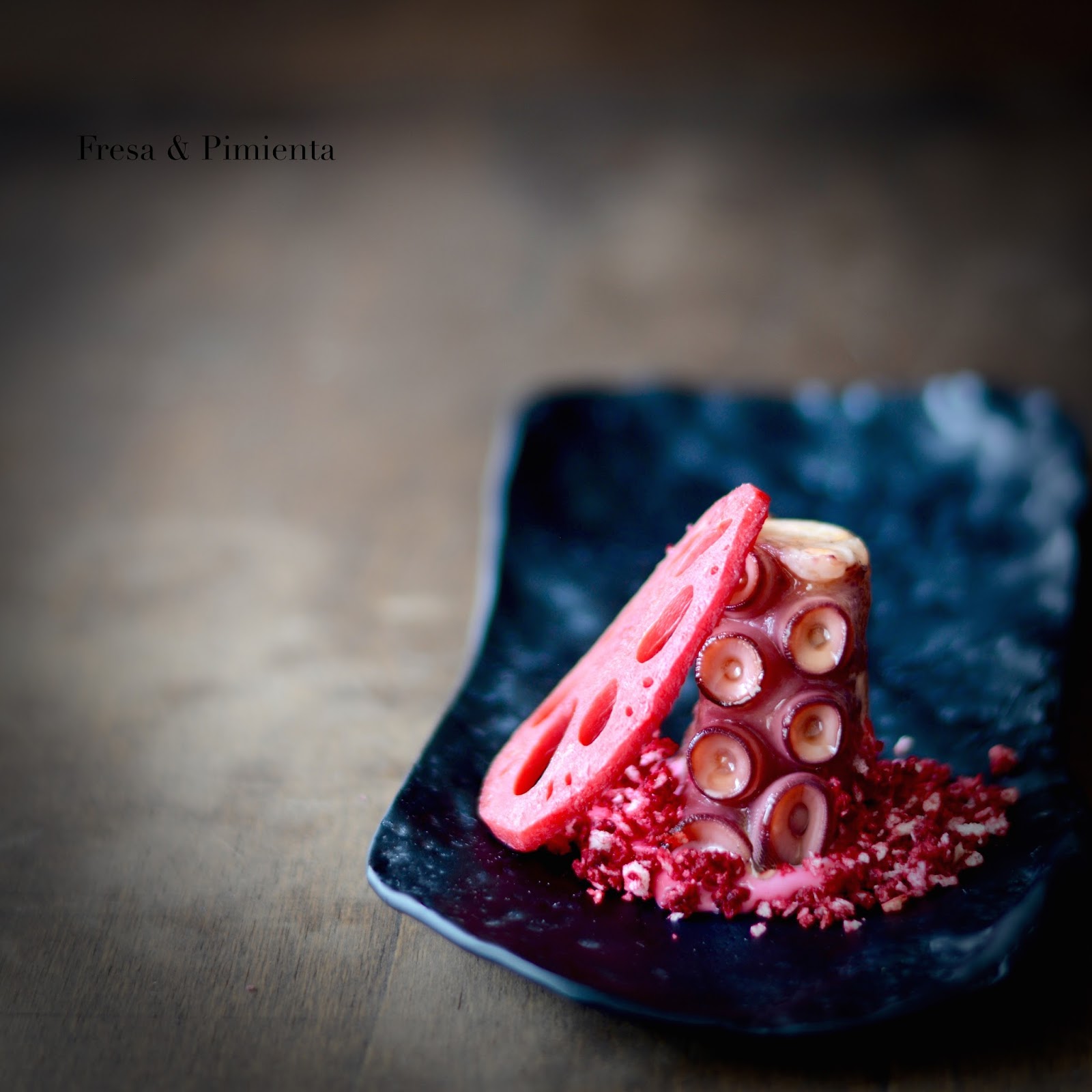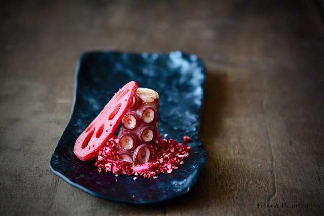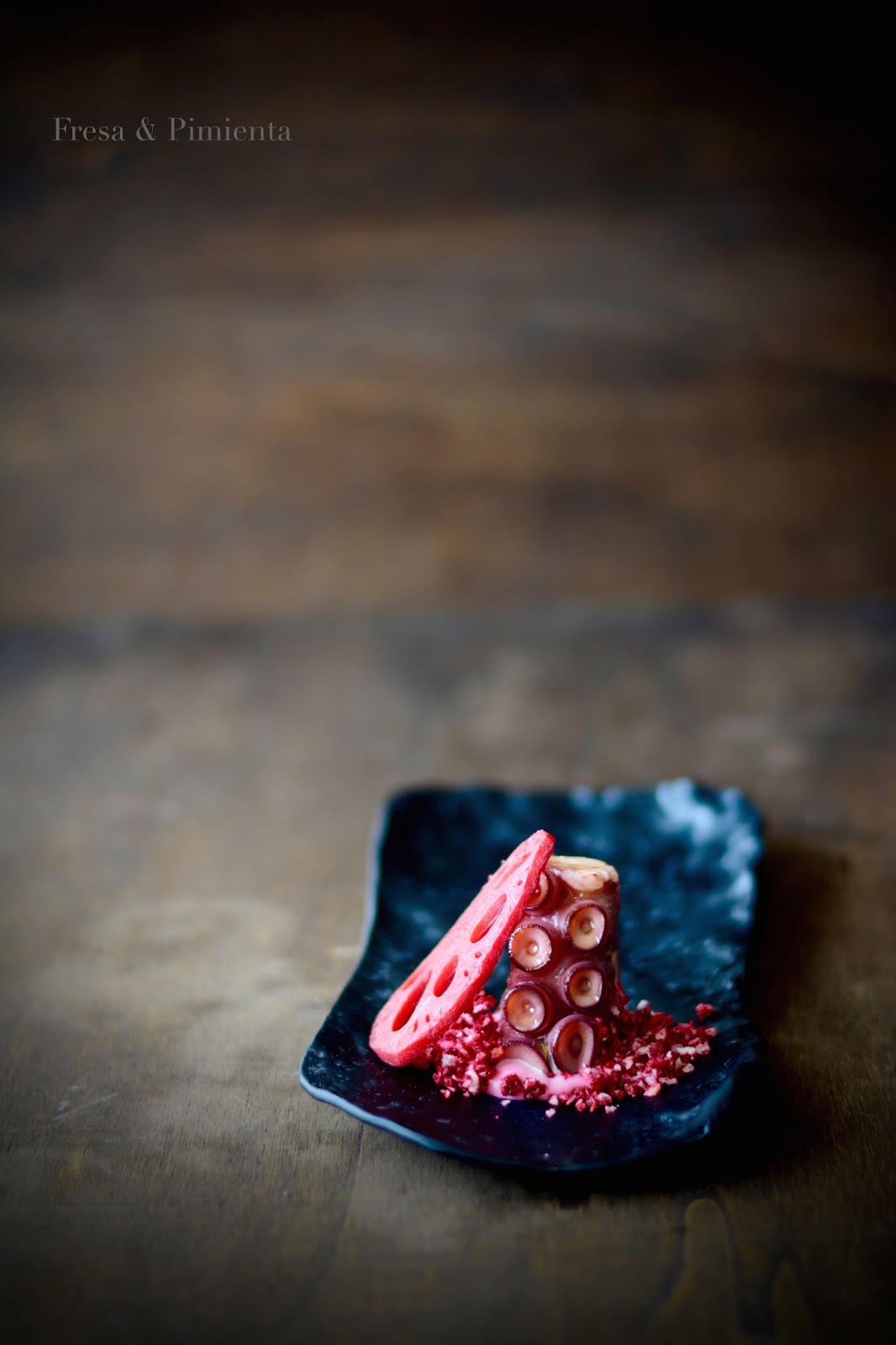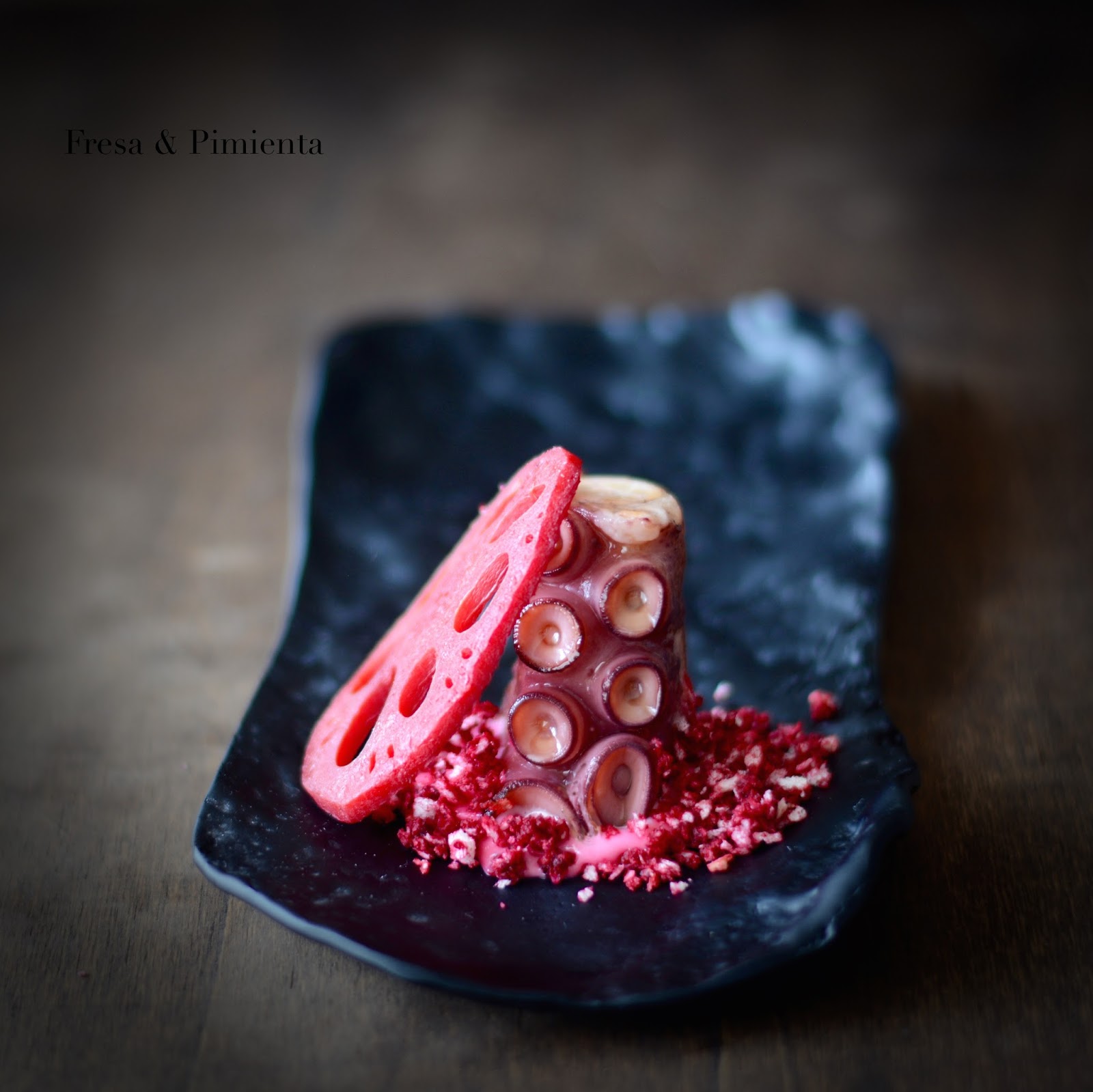 Momentos que veo “la vie en rose” y aprovechándolos he tratado de plasmarlo en una receta. Un pulpo marcado a la plancha con aceite de sésamo, previamente hervido, acompañado de unas migas rojas hiper crujientes que he hecho empapando el panko con el jugo del licuado de una remolacha, luego lo he deshidratado en el horno para conseguir una migas crujientes de intenso color y sabor. En la base del pulpo una mahonesa hecha a base jengibre y remolacha. Contraste de texturas, las crujientes del panko deshidratado, la untuosidad de la mahonesa y la carne tersa del pulpo, y como colofón una rodaja de raíz de flor de loto impregnada en jugo de remolacha hecha al vapor.