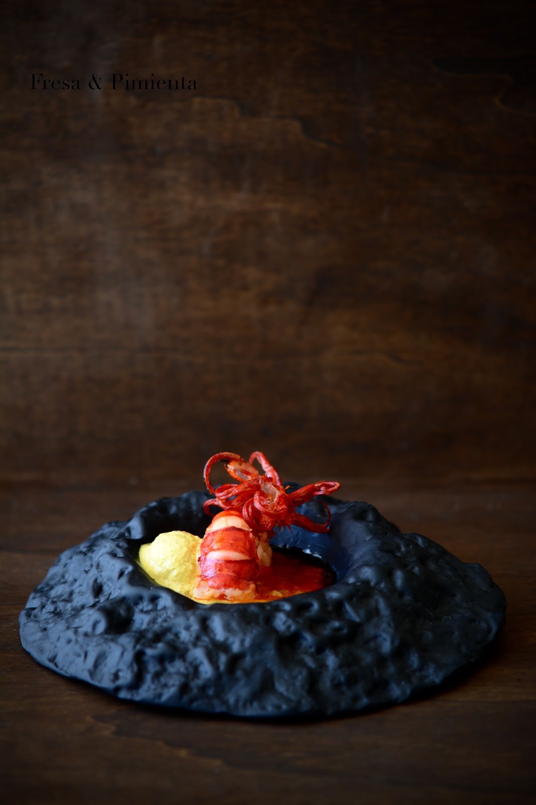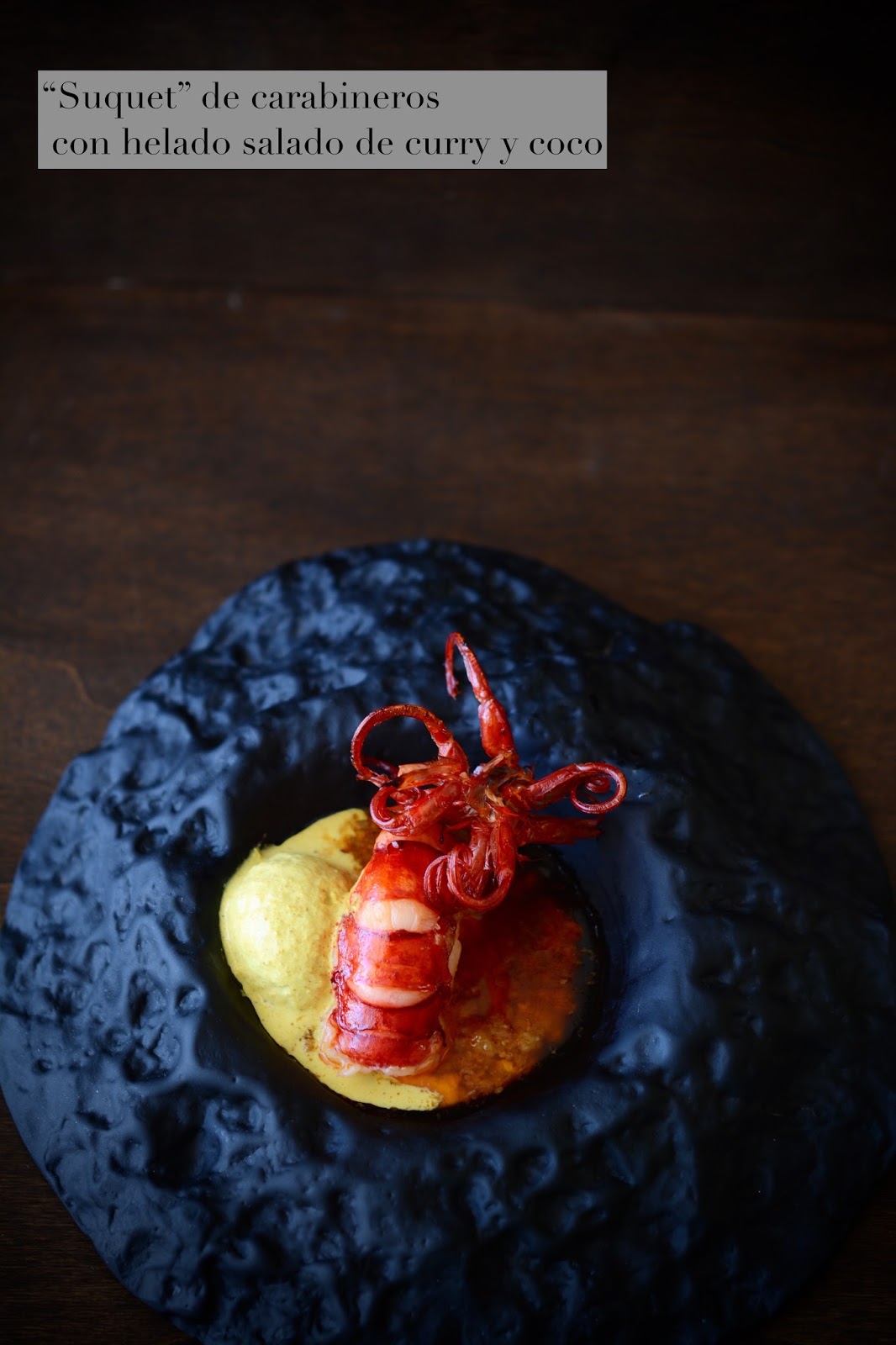 Emplatamos, para ello disponemos una cuharada de suquet con el cuerpo del carabinero. En un extremo, a modo de decoración, colocamos las patas del carabinero que babran tomado una bonita forma enrollada. Finalizamos sirviendo en un extremo del plato una pequeña bola de helado salado de curry y coco.