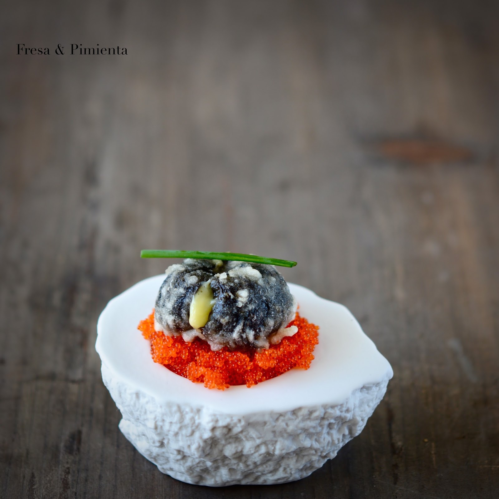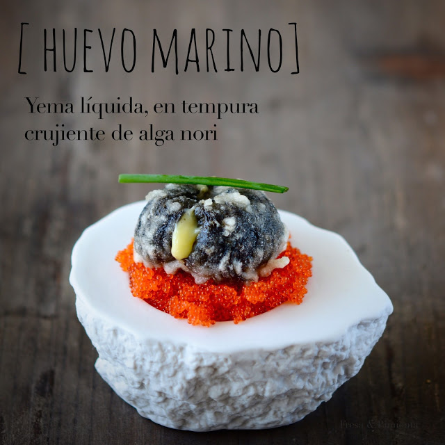 Una yema liquida en el interior, envuelta en una crujiente alga nori en tempura. Intenso sabor a mar en un bocado sorprendente, sobre huevas de pez volador.