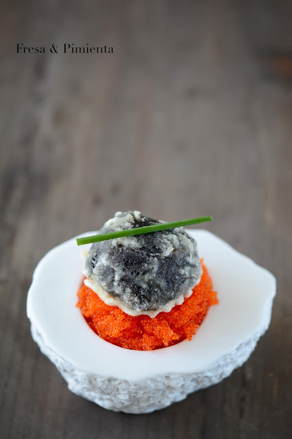 Montamos el plato para ello disponemos una cucharada de huevas de pez volador y sobre éstas depositamos un yema envuelta en tempura de alga nori. Depositamos unas escamas de sal.