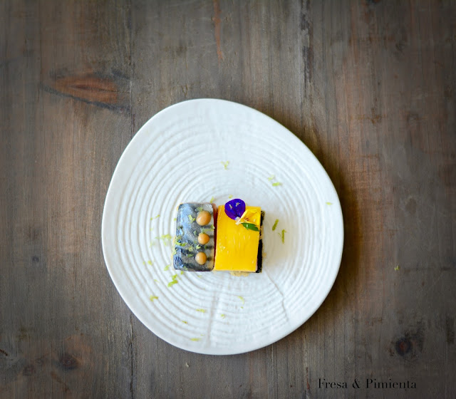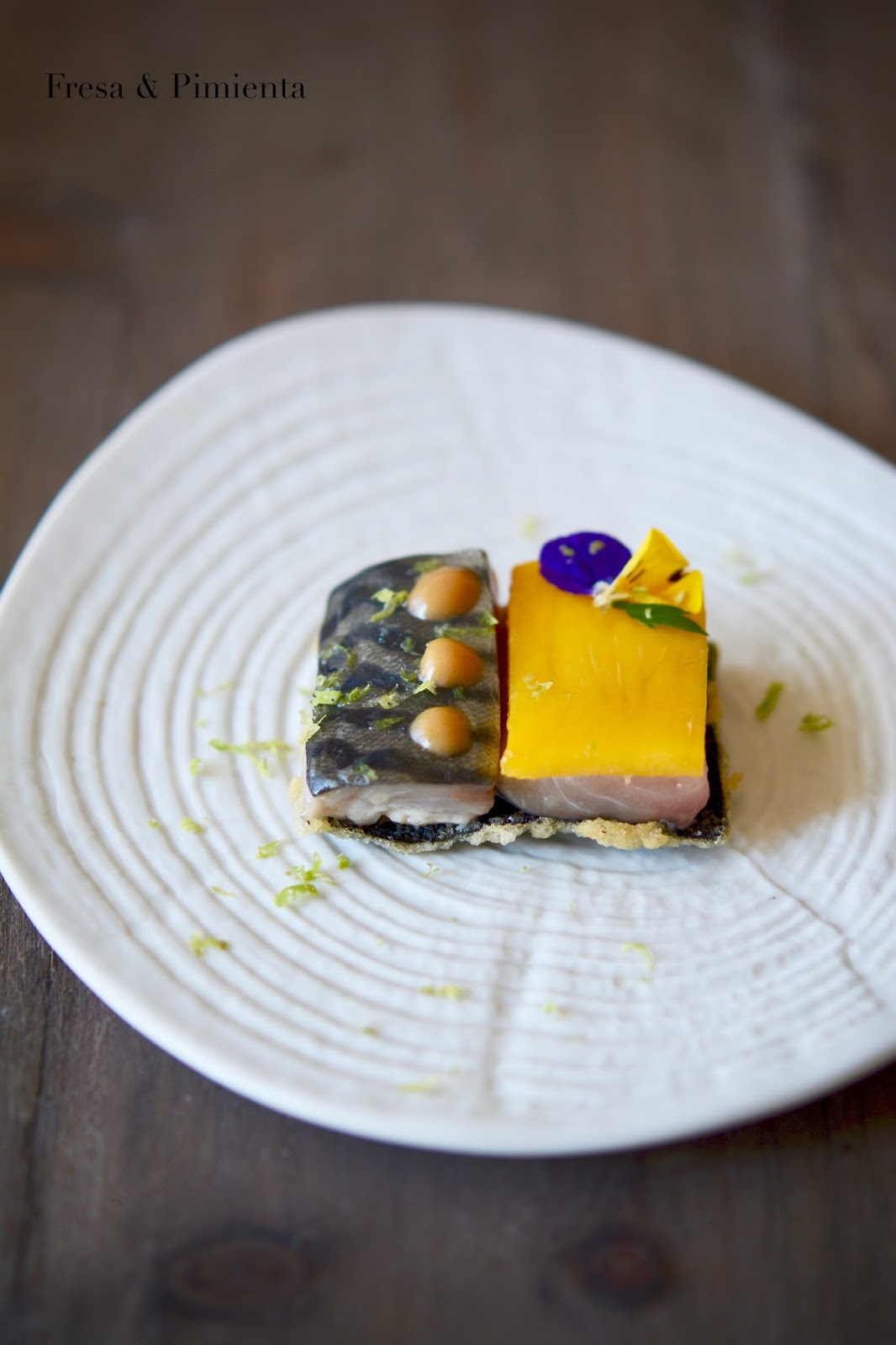 Caballa con mango sobre crujiente de alga nori y salsa de cacahuete, mirin y soja