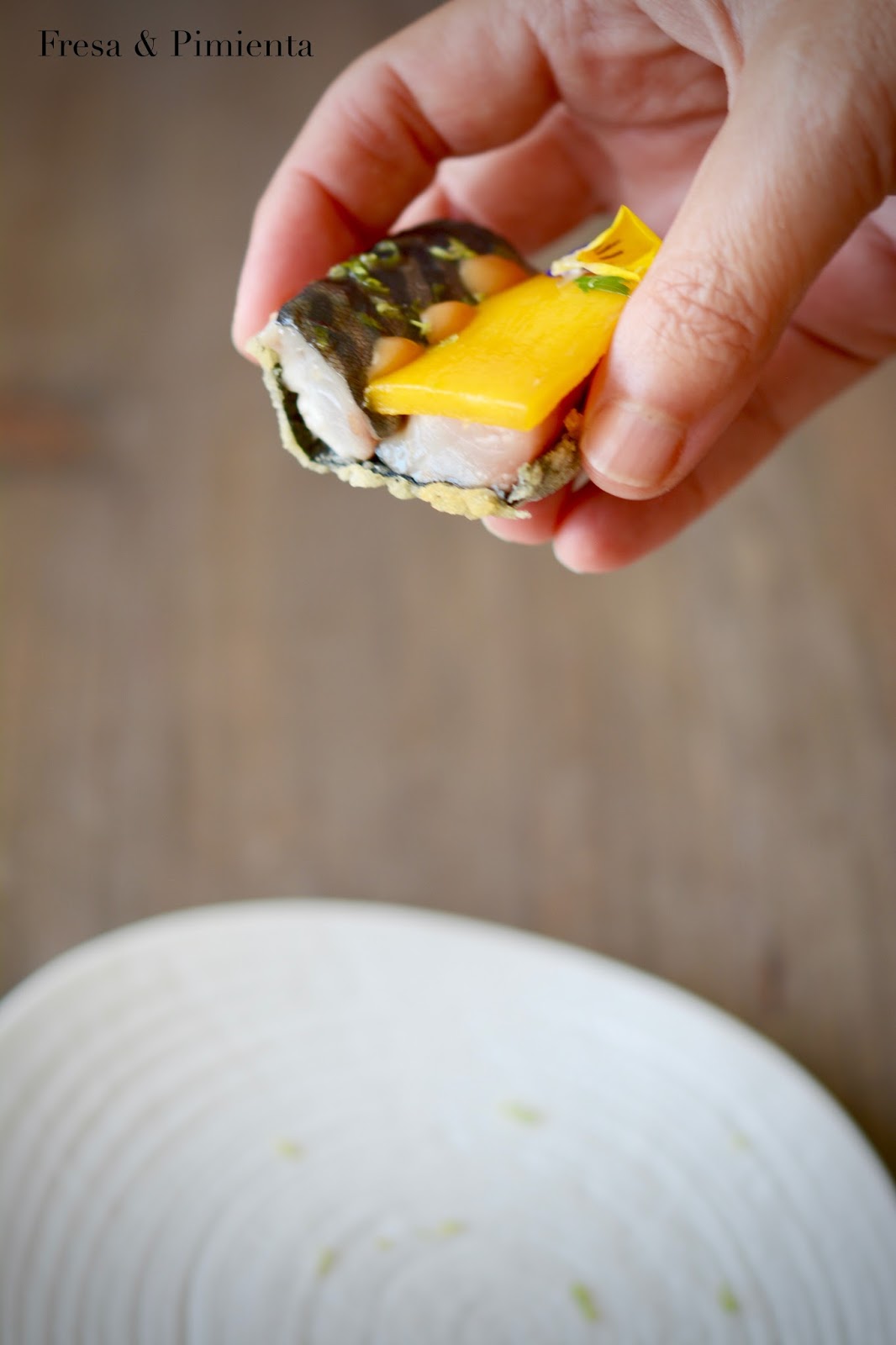 Un bocado de contrastes, la frescura y dulzor del mango, el intenso sabor de la caballa y la textura crujiente de un alga nori en tempura de arroz. Todo aderezado con una salsa elaborada con una base de cacahuete, mirin y soja. Para comerlo tan solo debemos cogerlo con las manos y tomarlo a modo de “taco”.