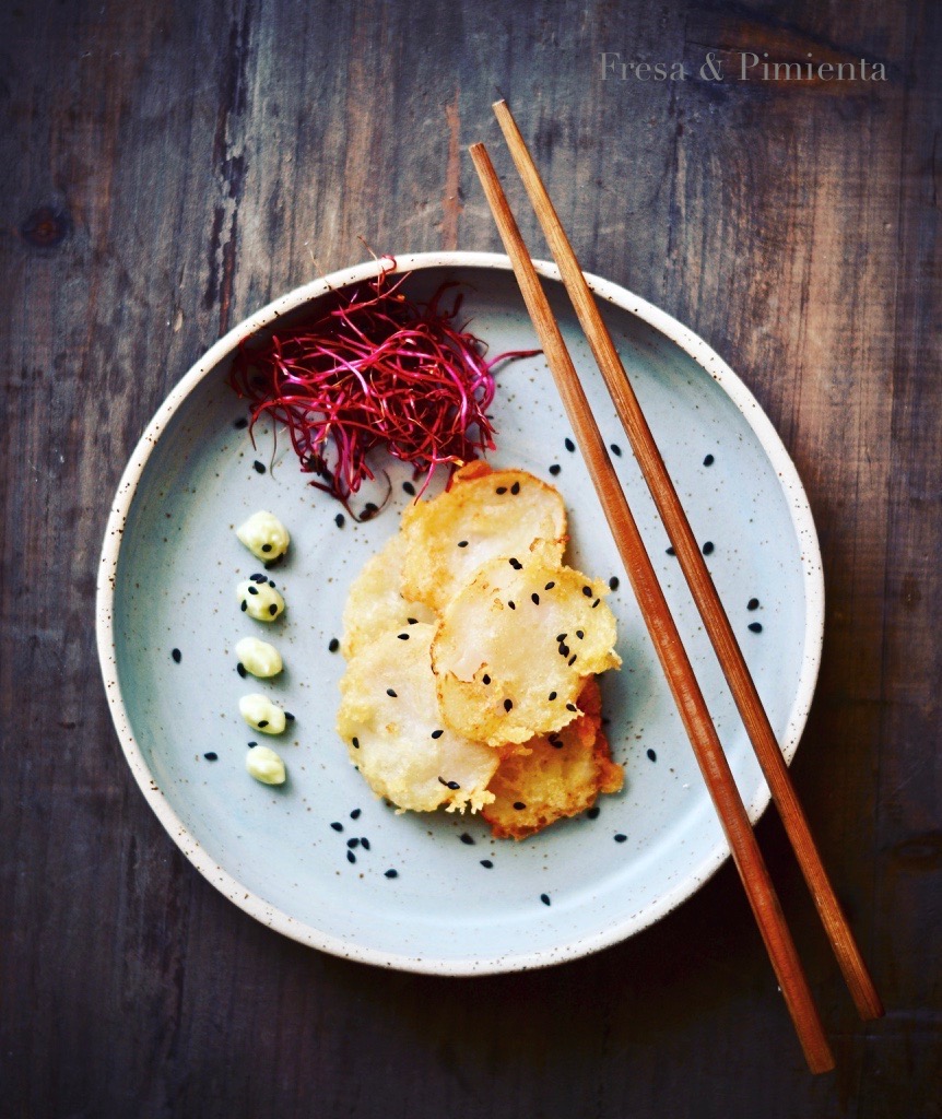 Para aderezarlas propongo untarlas ligeramente con una mantequilla que he batido con wasabi, a temperatura ambiente, que se funde al entrar en contacto con la tempura , dejando aflorar el sabor y aroma del wasabi entre la textura aterciopelada de la mantequilla.