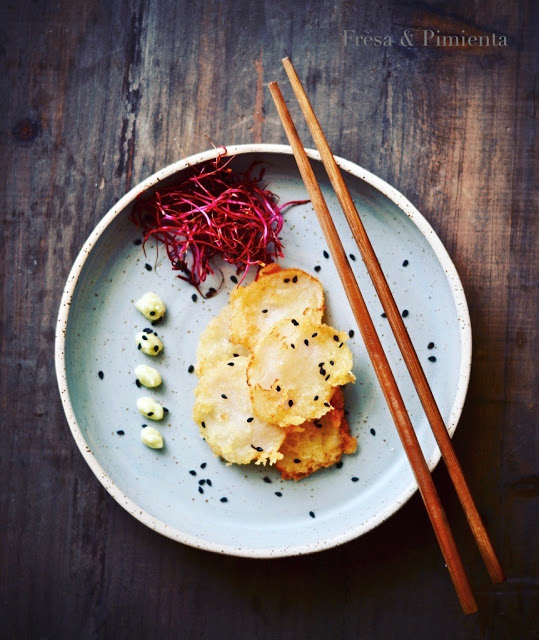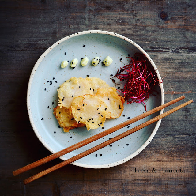 Un aperitivo a base de vieira, en este caso la he laminado y pasado por un tempura muy ligera hecha a base de harina de arroz y cerveza, el resultado son unas láminas hipercrujientes.