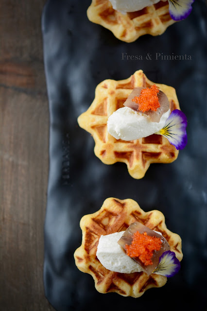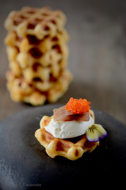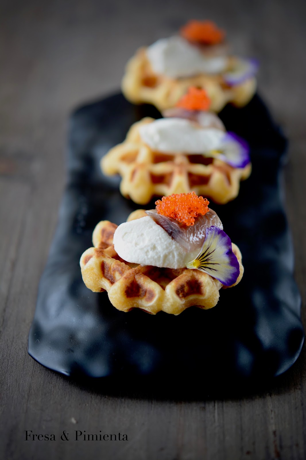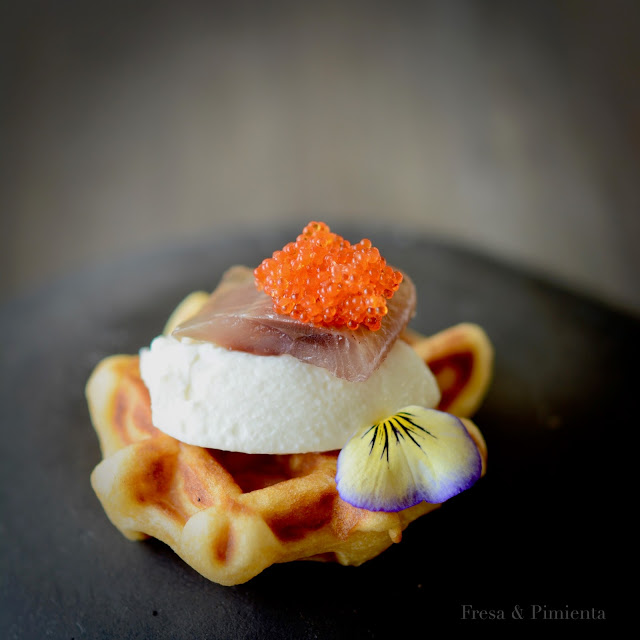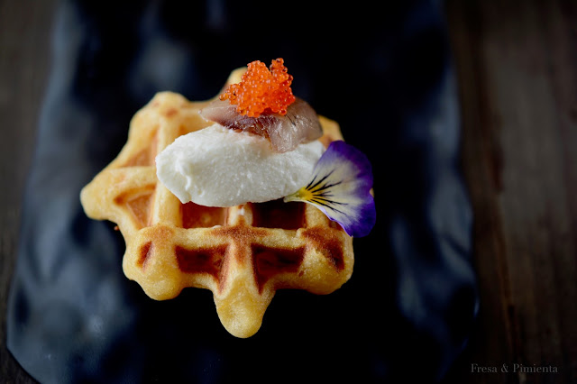 Un aperitivo otoñal, cuya base es un pequeño gofre salado de boniato. Sobre éste he colocado una quenelle de queso mascarpone, que le aporta untuosidad al potente sabor de la sardina ahumada combinada con unas huevas tobiko. Podemos sustituir las sardinas ahumadas por unas sardinas curadas en sal, y en lugar de huevas tobiko podríamos utilizar huevas de salmón. Las posibilidades que admite este aperitivo son diversas.