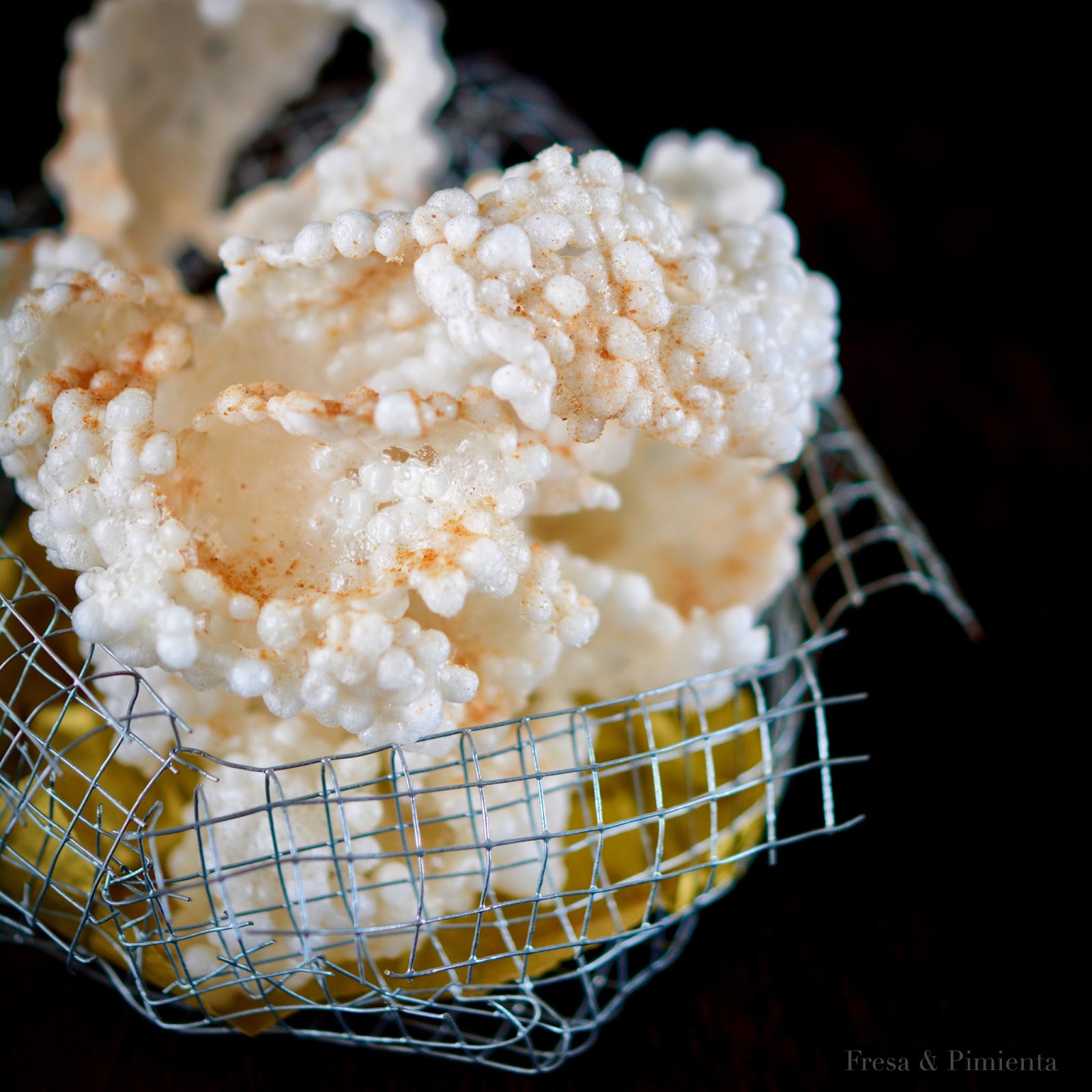 Este es un snack que he elaborado hirviendo previamente la tapioca, para deshidratarla posteriormente en el horno durante 4 horas, así se obtiene una base que al freírla se hincha, “sufla”, creando estas originales chips hiper crujientes de tapioca. El sabor del snack se lo he proporcionado con un polvo de pulpo seco totalmente natural y con un sorprendente sabor. Un snak adictivo!