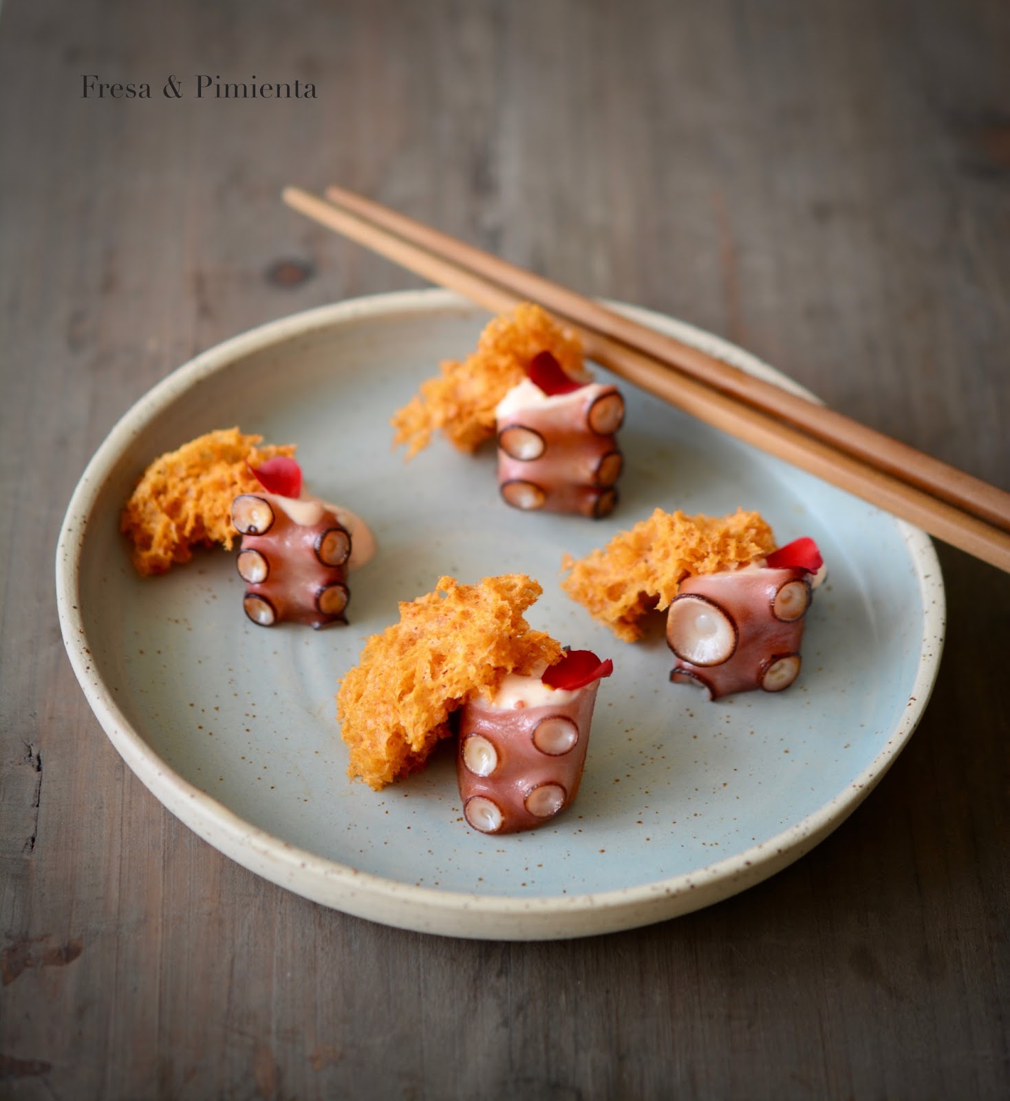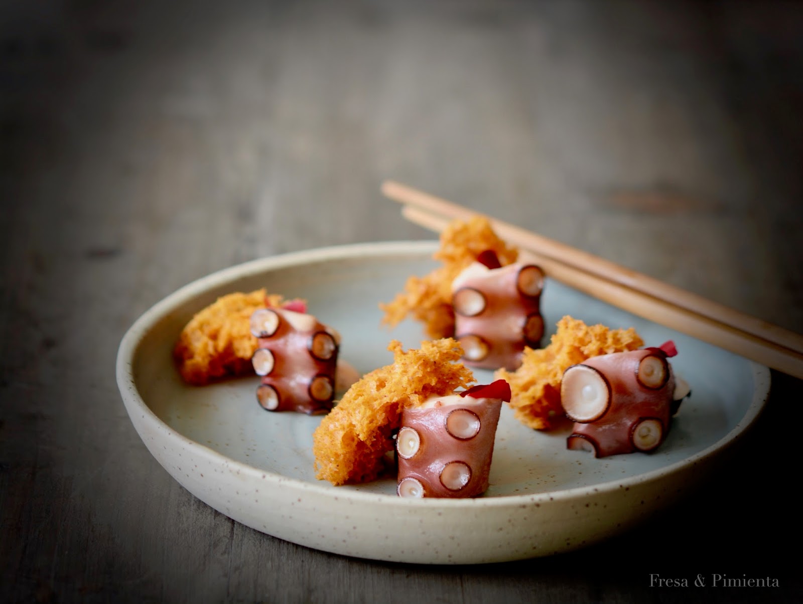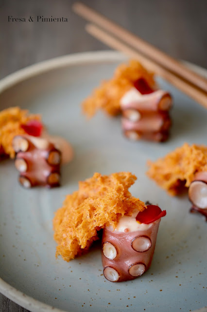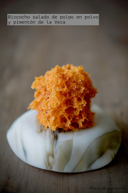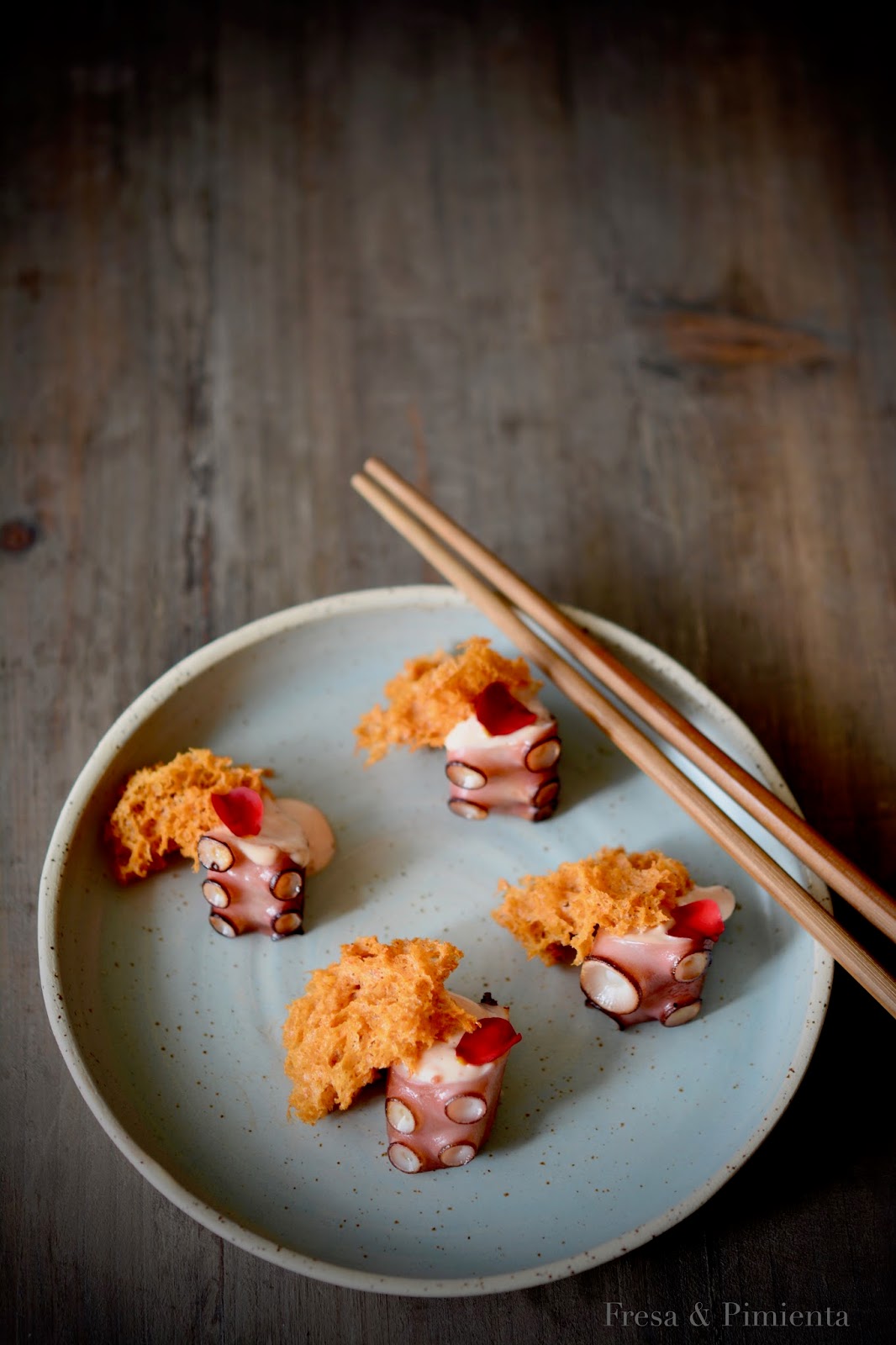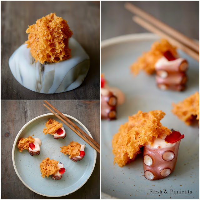 Un aperitivo donde el protagonista principal es el pulpo seco, el cual secan de forma artesanal, me ha sorprendido cómo con el secado del pulpo se consigue este intenso y fantástico sabor. Lo he marcado en plancha y condimentado con una mahonesa elaborada con kimchi (una preparación de origen coreano elaborada a base de vegetales fermentados con diferentes especias); acompañado con un bizcocho salado que se me ha ocurrido elaborar con pimentón de la vera y pulpo en polvo. La combinación de texturas y sabores es ideal.