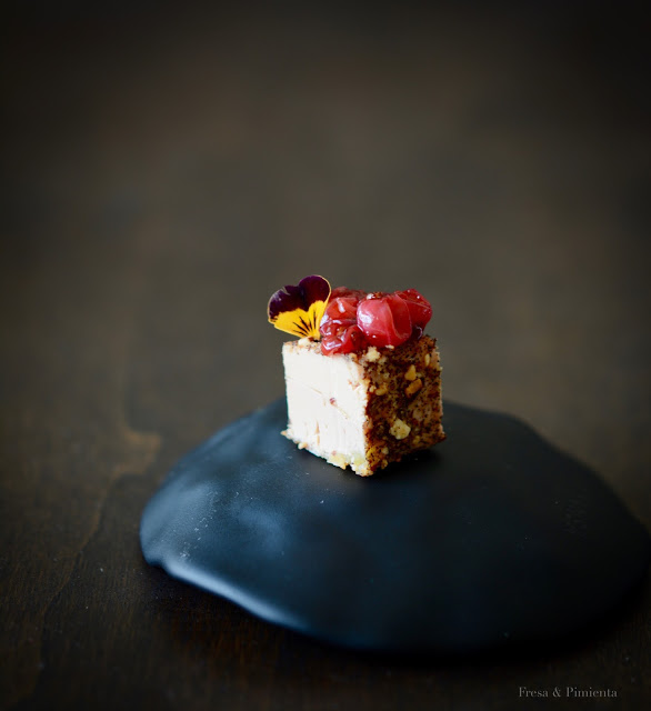 Cogemos el bloque de foie mi cuit y lo rebozamos en la mezcla anterior de almendras. Cortamos dados del tamaño deseado. Finalmente sobre cada dado de foie micuit disponemos cuatro o cinco