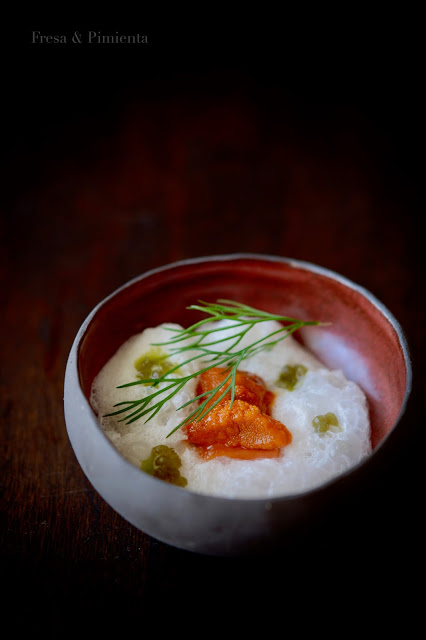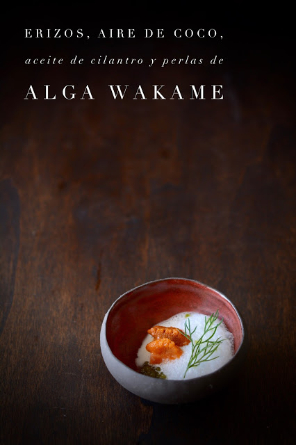 Un aperitivo en el que predomina el intenso sabor de los erizos frescos. Un aire etéreo de coco le aporta un punto de dulzor que sin enmascarar el sabor del erizo, suaviza algunas alguna de sus notas. las gotas de aceite de cilantro le aporta un punto de frescura , y las perlas de alga wakame rematan el intenso sabor a mar que marca este platillo.