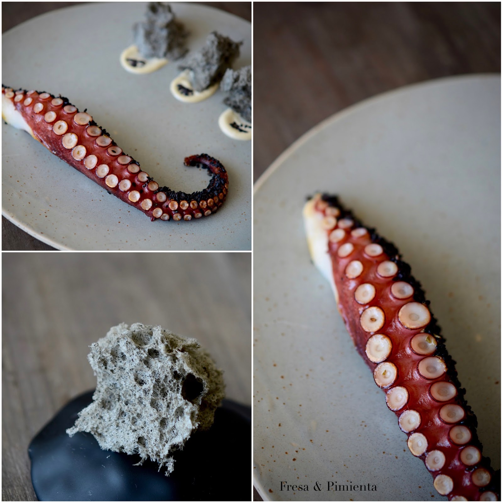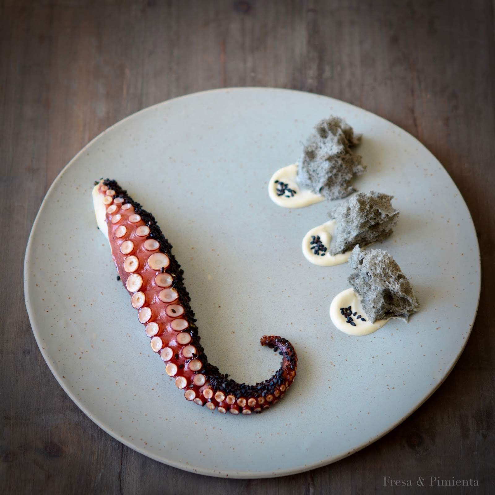 La base de este plato es un sabroso pulpo “seco,”, secado de forma artesanal, siguiendo el modo tradicional, que le aporta gran intensidad en sabor. Al haber sido el pulpo previamente secado, la forma de cocinarlo es distinta a un pulpo fresco, por tanto no debe hervirse, y su sabor es muy potente. He untado las patas de pulpo (en uno de sus lados) con pasta miso y sésamo negro, para posteriormente marcarlo en la plancha. Para aderezarlo he elaborado una mahonesa de aires asiáticos, en la que predomina el ponzu (salsa japonesa), vinagre de arroz y aceite de sésamo. Y para acompañar el bocado un bizcocho salado que he realizado con pasta de sésamo negro.