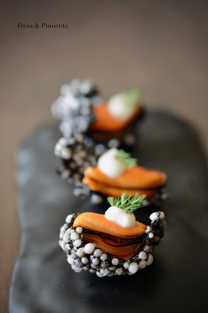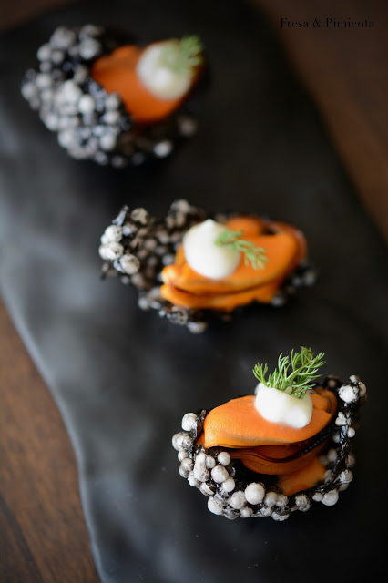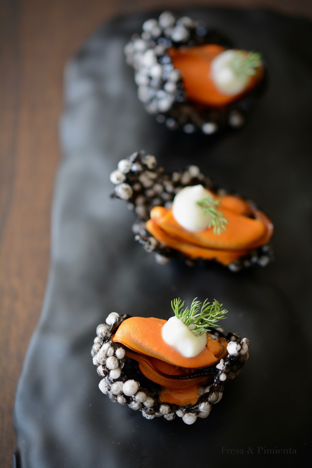 Un snack muy original y sabroso, cuya base es un crujiente de tapioca impregnada con tinta de sepia. Para elaborar esta base tan crujiente se hierve previamente la tapioca, se impregna con la tinta y posteriormente se deshidrata en el horno unas horas. Con este proceso se obtiene una base que al freírla se hincha, “sufla”, obteniendo estas originales chips crujientes de tapioca con tinta, con un intenso sabor a mar. Sobre éstas una mahonesa picante elaborada con sriracha, un mejillón al vapor infusionado en jengibre y un untuoso parmentier de coliflor.