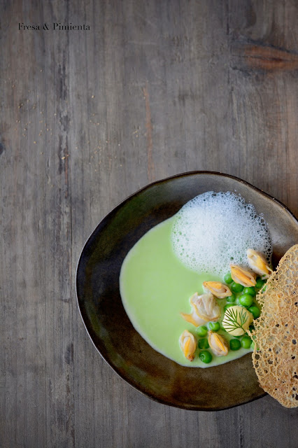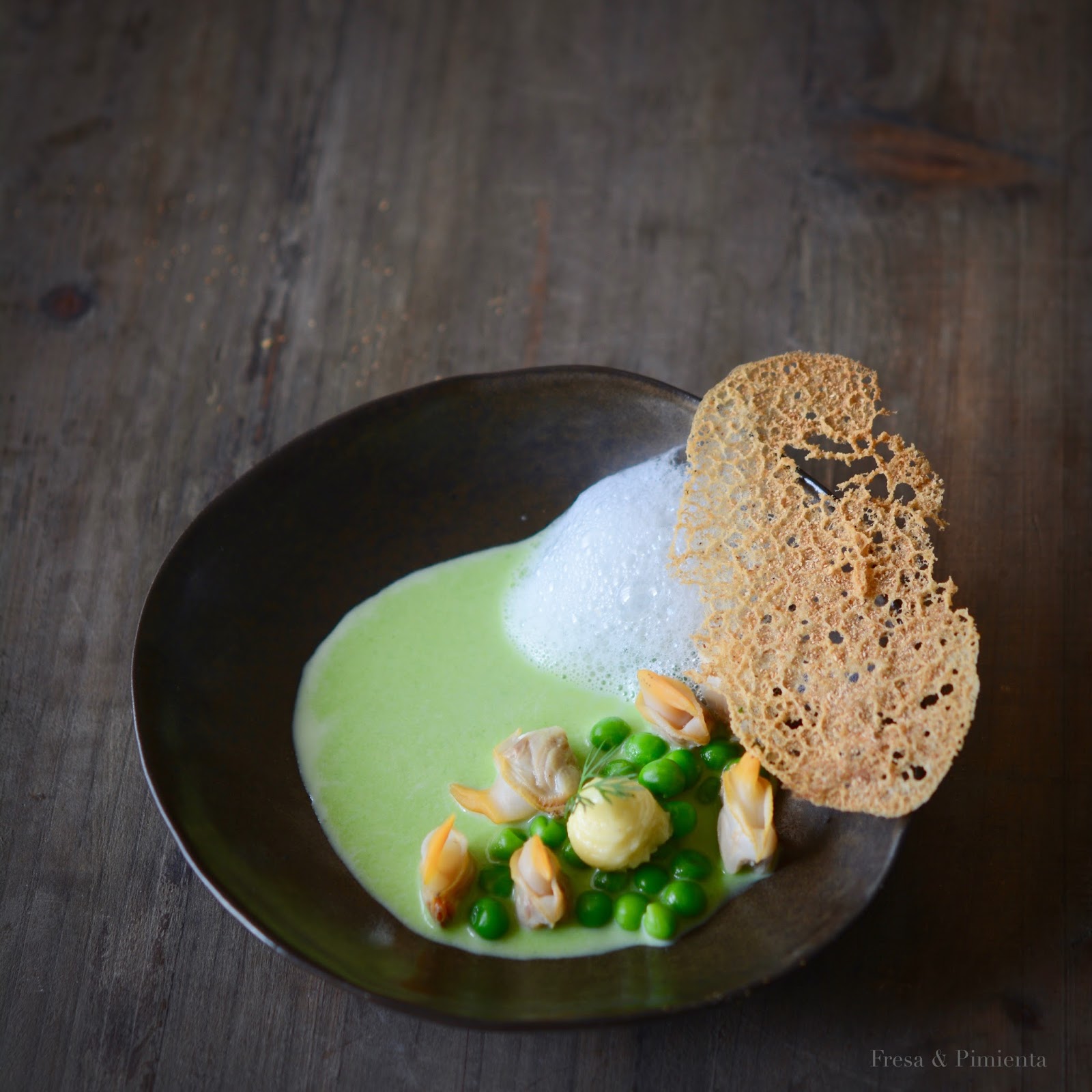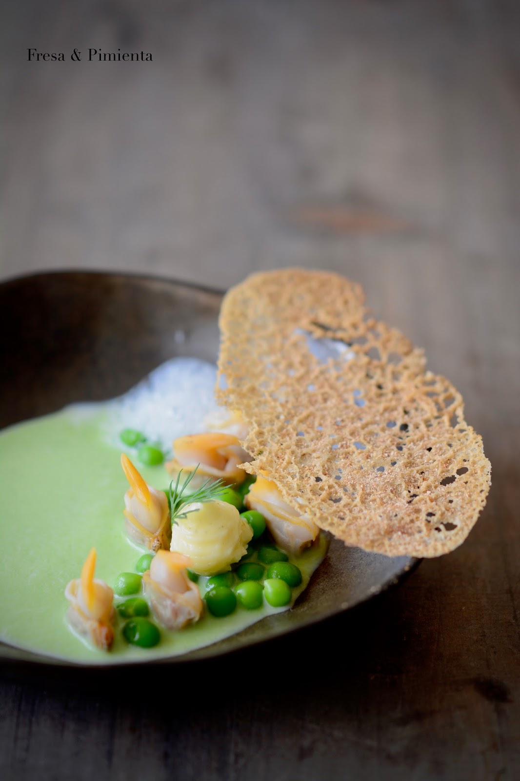 Una crujiente tortita de garbanzos con pulpo en polvo, al estilo “tortita de camarones” pero sustituyendo a éstos por el intenso sabor a mar que le aporta el pulpo en polvo. Éste es el complemento crujiente de un refrescante plato de berberechos al vapor con guisantes aromatizados con menta y un etéreo aire de pimienta de Sichuan.