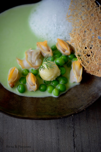 Montamos el plato, para ello depositamos la cremita de guisantes y menta, sobre ésta pequeños montoncitos de guisantes escaldados alternados con los berberechos al vapor. En el centro un pequeño montículo de mantequilla ahumada y una hebra de eneldo fresco. En un costado, con ayuda de una cuchara agujereada depositamos, con cautela, el aire de pimienta que se encontraba en la superficie. Finalizamos con la tortita en un extremo del plato.