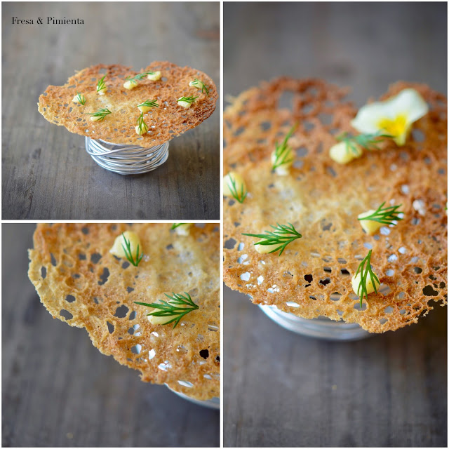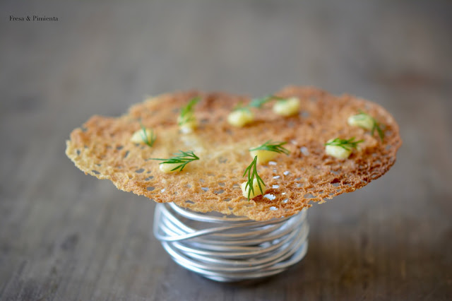 Opcionalmente, podemos decorar la tortita de pulpo. Para ello con ayuda de la manga pastelera depositamos diminutos montículos de mantequilla ahumada sobre la tortita de pulpo, y en cada montículo unas hebras de eneldo fresco.