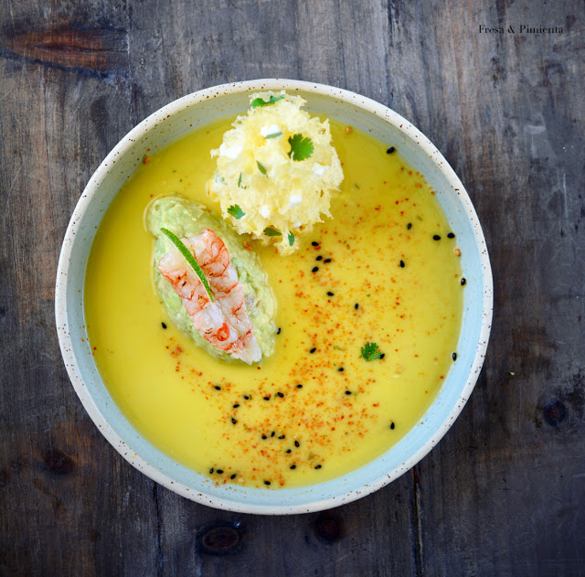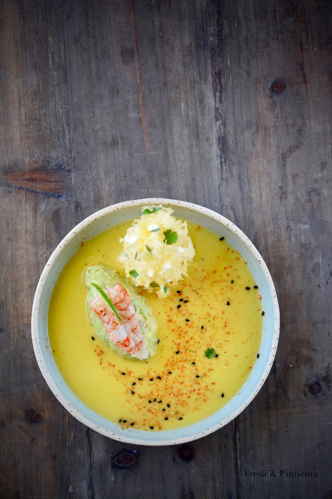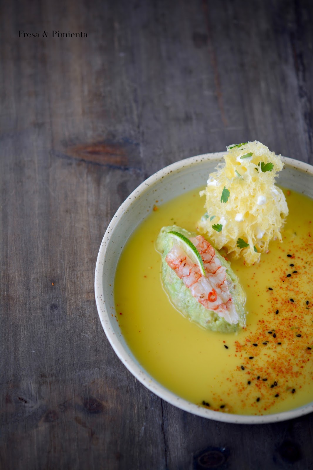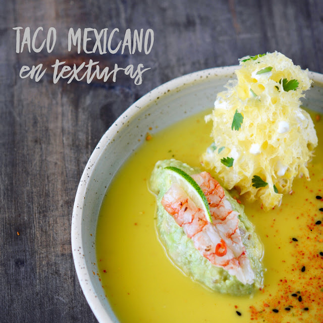 Me gustan los tacos y me gusta jugar con sus texturas. Ya hice una receta de una esterificación de un taco mexicano (la encontraréis en el índice de recetas , y en mi libro “Fresa y Pimienta. Fusión en un bocado”) pero esta vez quería hacer un taco con varias texturas diferentes, a la vez que mantuviera su sabor característico. Para ello he elaborado una base de sopa fría de maíz dulce y chile picante, textura líquida que sustituye la tortita de maíz del típico taco, y a su vez el maíz también está presente en un bizcocho salado que he elaborado con harina de maíz. Entre sus agujeritos se esconden hojas de cilantro fresco y pequeñas puntadas de mahonesa de lima.  Lo acompaña una quenelle de guacamole y sobre ésta una gamba cocinada superficialmente con soplete, que mantiene su intenso sabor.