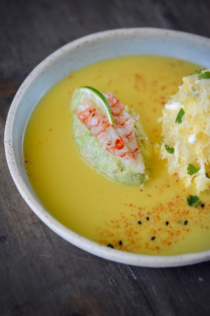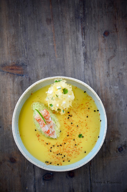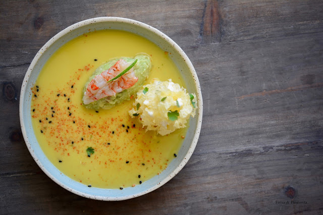Taco mexicano en texturas [sopa fría de maíz dulce y chile, bizcocho salado de maíz con cilantro y mahonesa de lima, quenelle de guacamole y gamba sopleteada]
